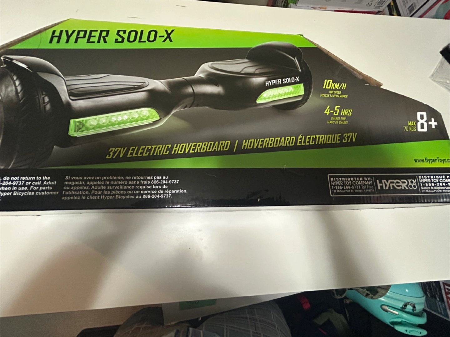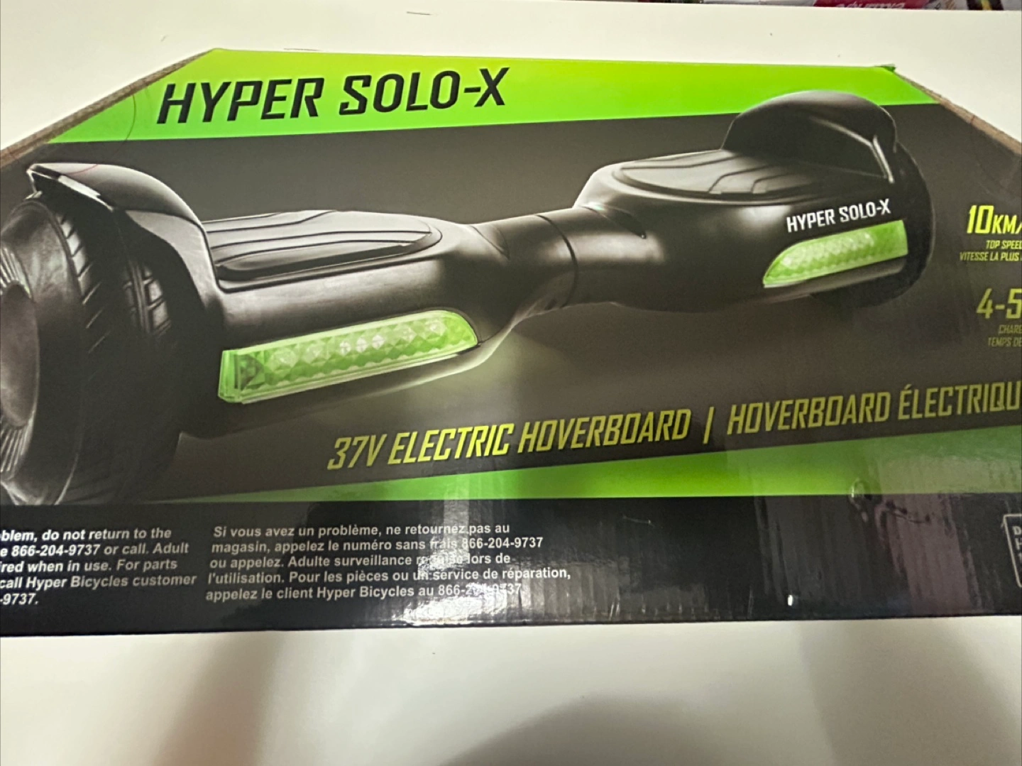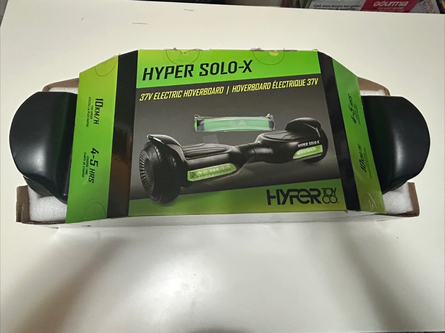 Selling a Hyper Toy Co. SOLO-X 37V Electric Hoverboard! It has a top speed of 10km/h and a charge time of 4-5 hours. Comes with the original box!
