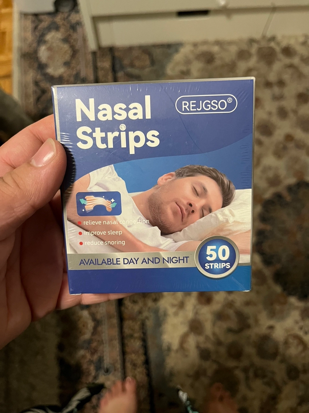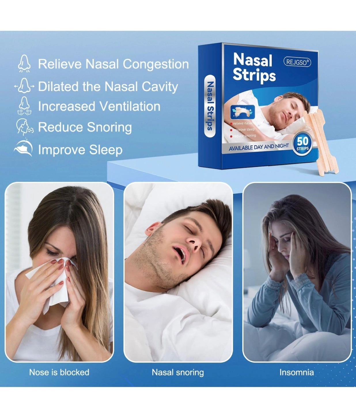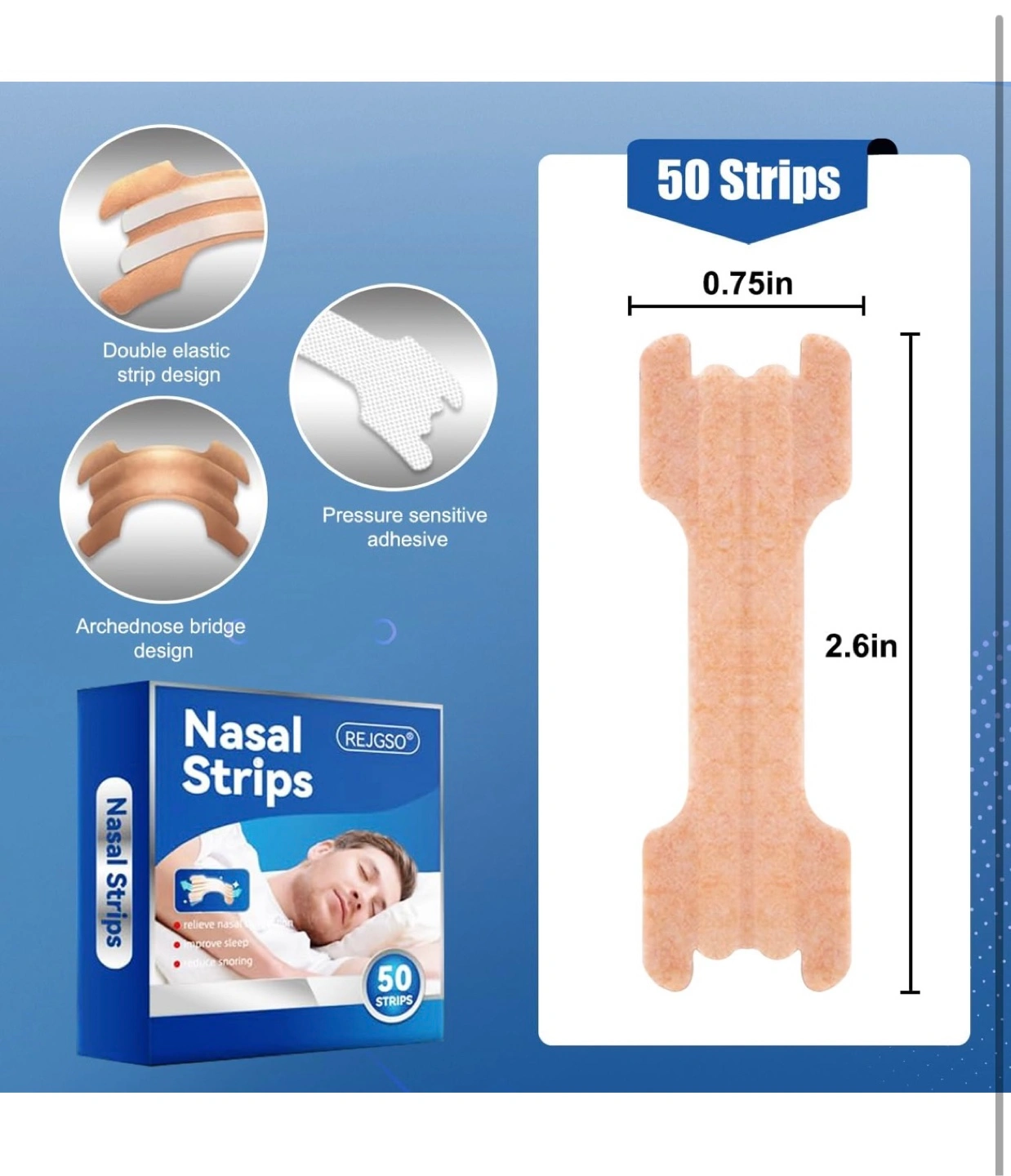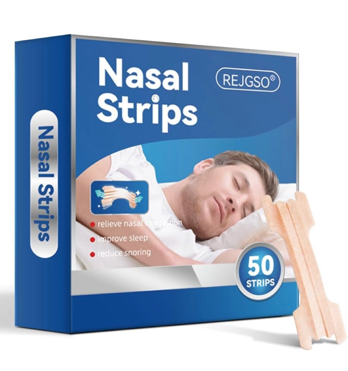 I'm selling a box of REJGSO nasal strips. Each box contains 50 strips. They're designed to help relieve nasal congestion and reduce snoring. These strips feature a double elastic strip design, pressure-sensitive adhesive, and an arched bridge design for comfortable wear. Brand new inbox never opened still sealed.