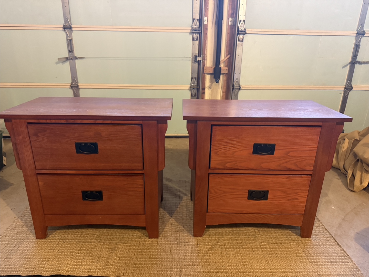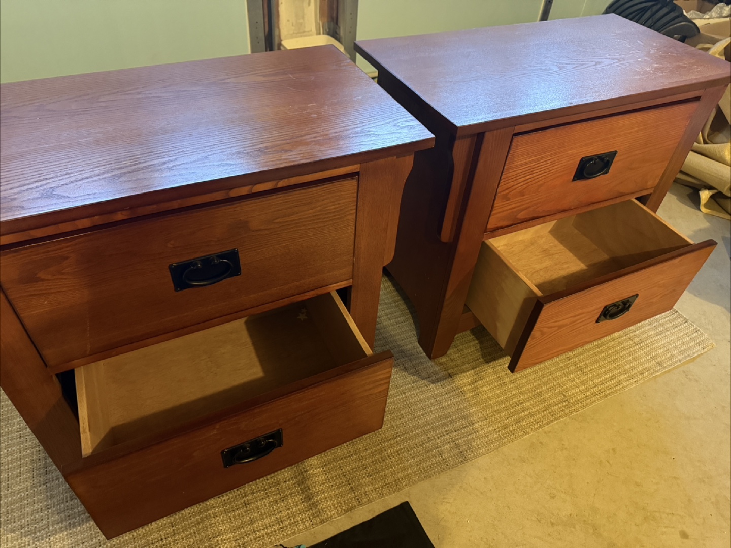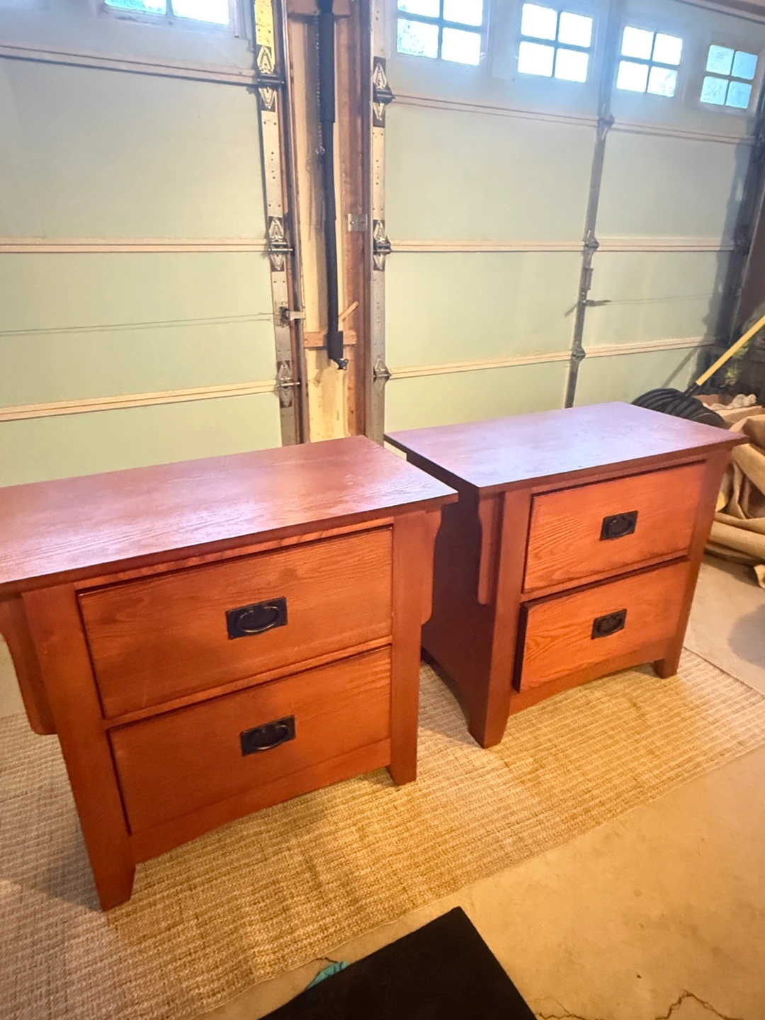 Selling a pair of wood nightstands. They feature a warm, reddish-brown finish and have a single drawer with a dark handle. These nightstands would look great in any bedroom!