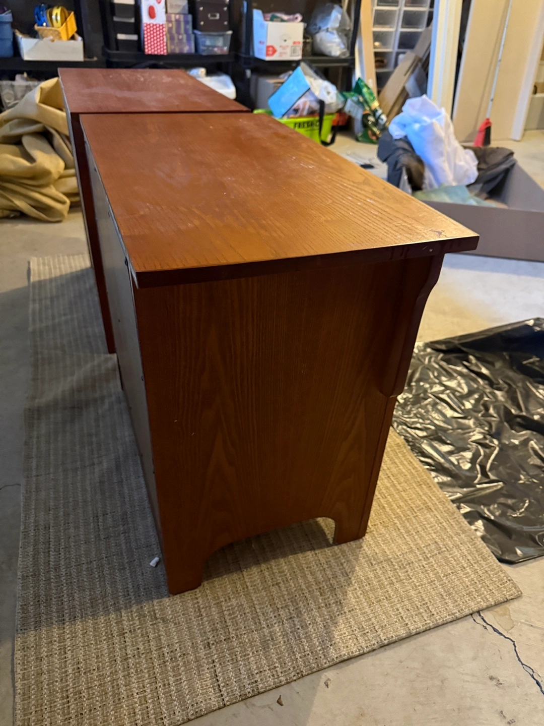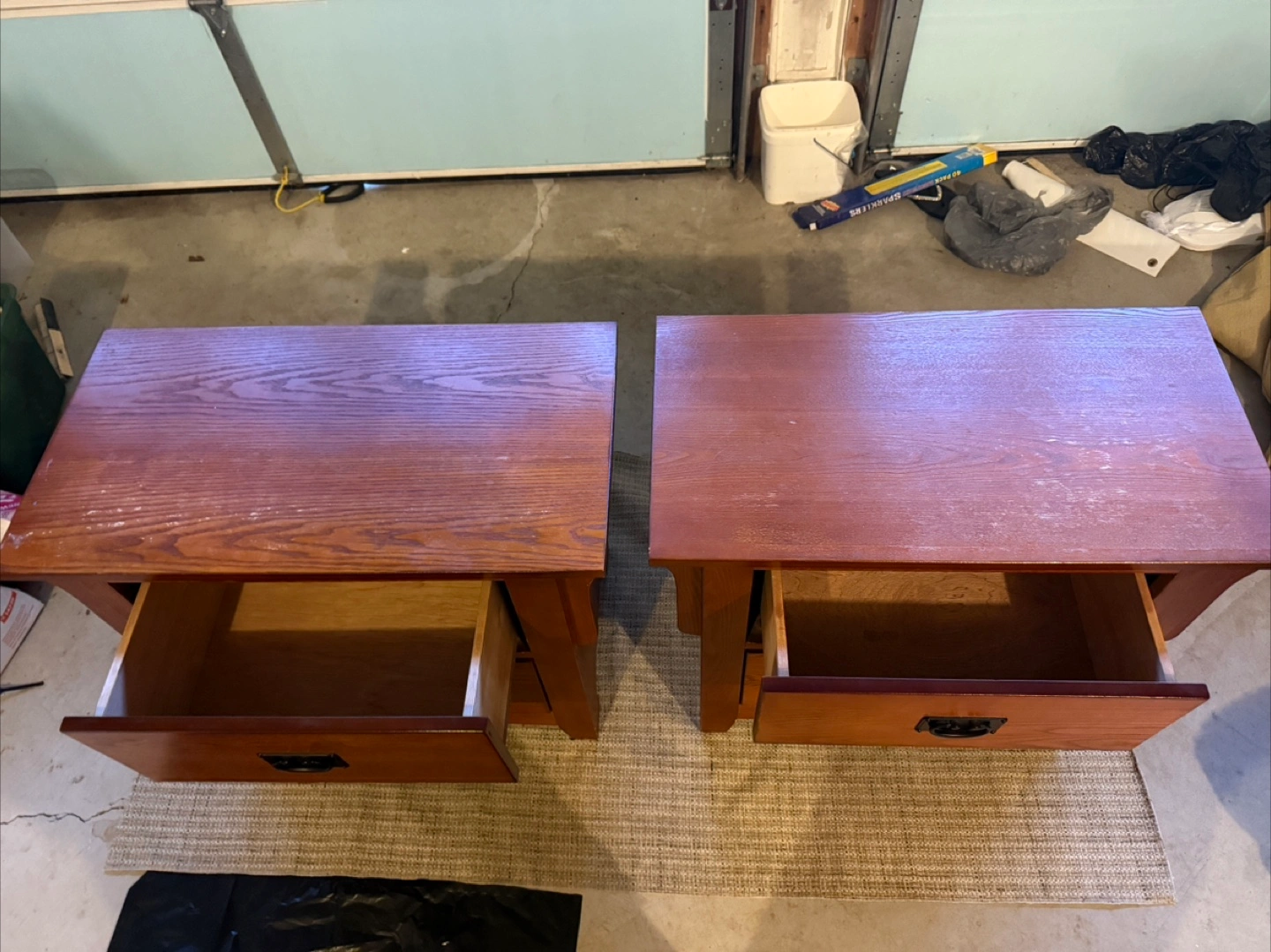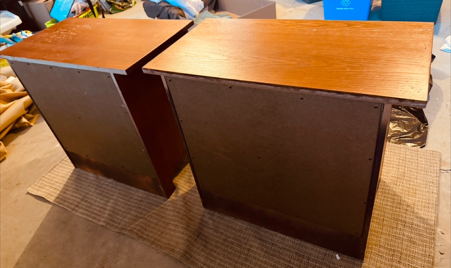 Selling a pair of wood nightstands. They feature a warm, reddish-brown finish and have a single drawer with a dark handle. These nightstands would look great in any bedroom!