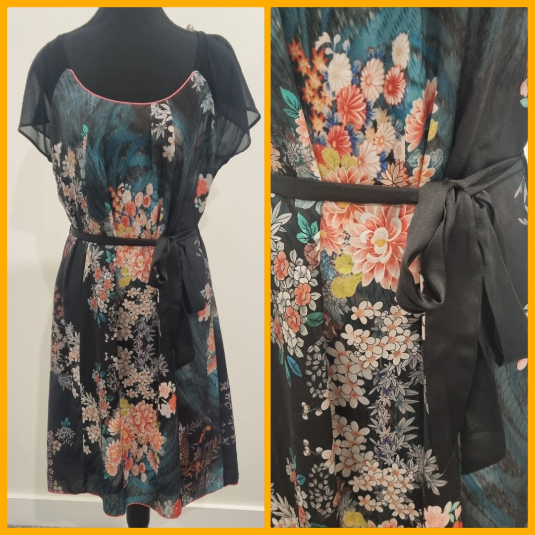 This is a lovely floral print dress! It features a black belt to cinch the waist and has short sleeves. The dress is perfect for a casual outing or a special occasion