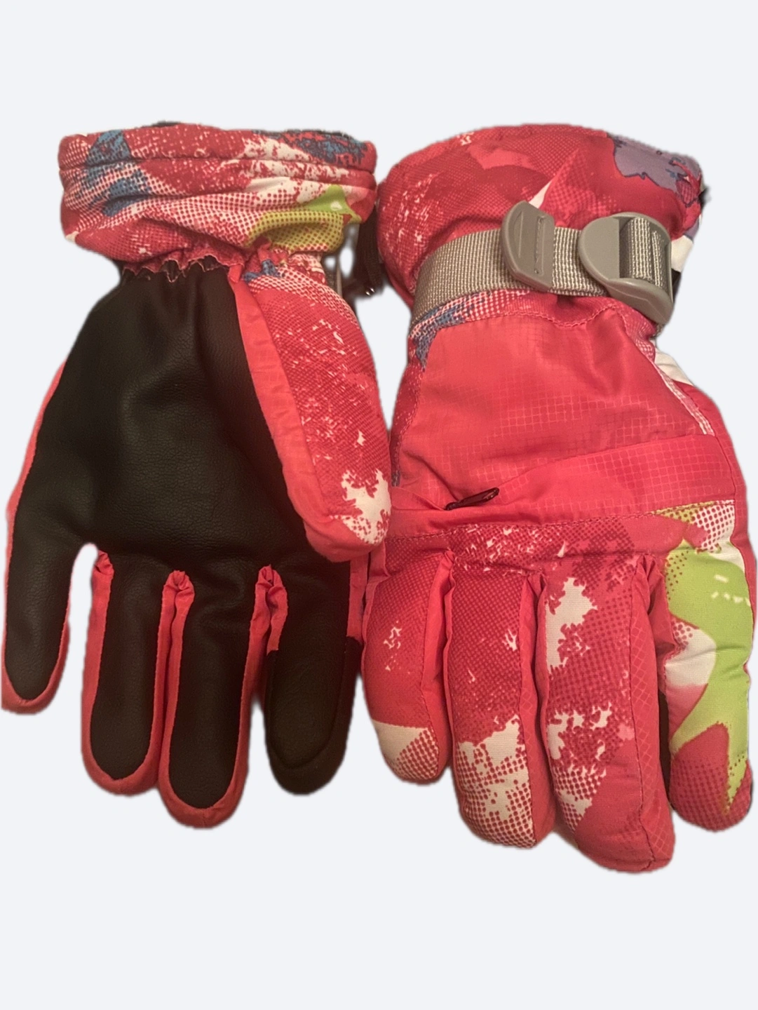 These are a pair of pink winter gloves, perfect for keeping your hands warm during those cold Canadian winters! They feature a fun, colourful pattern and a secure wrist strap to ensure a snug fit. The palms are black, providing a good grip. Great for skiing, snowboarding, or just playing in the snow