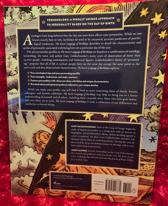 Selling 'The Secret Language of Birthdays' by Gary Goldschneider and Joost Elffers! It's a complete personology guide for each day of the year. This book gives you your astrological sign and personology profile, plus your strengths, weaknesses, and major concerns. It also includes practical advice and spiritual guidance tailored to your unique destiny