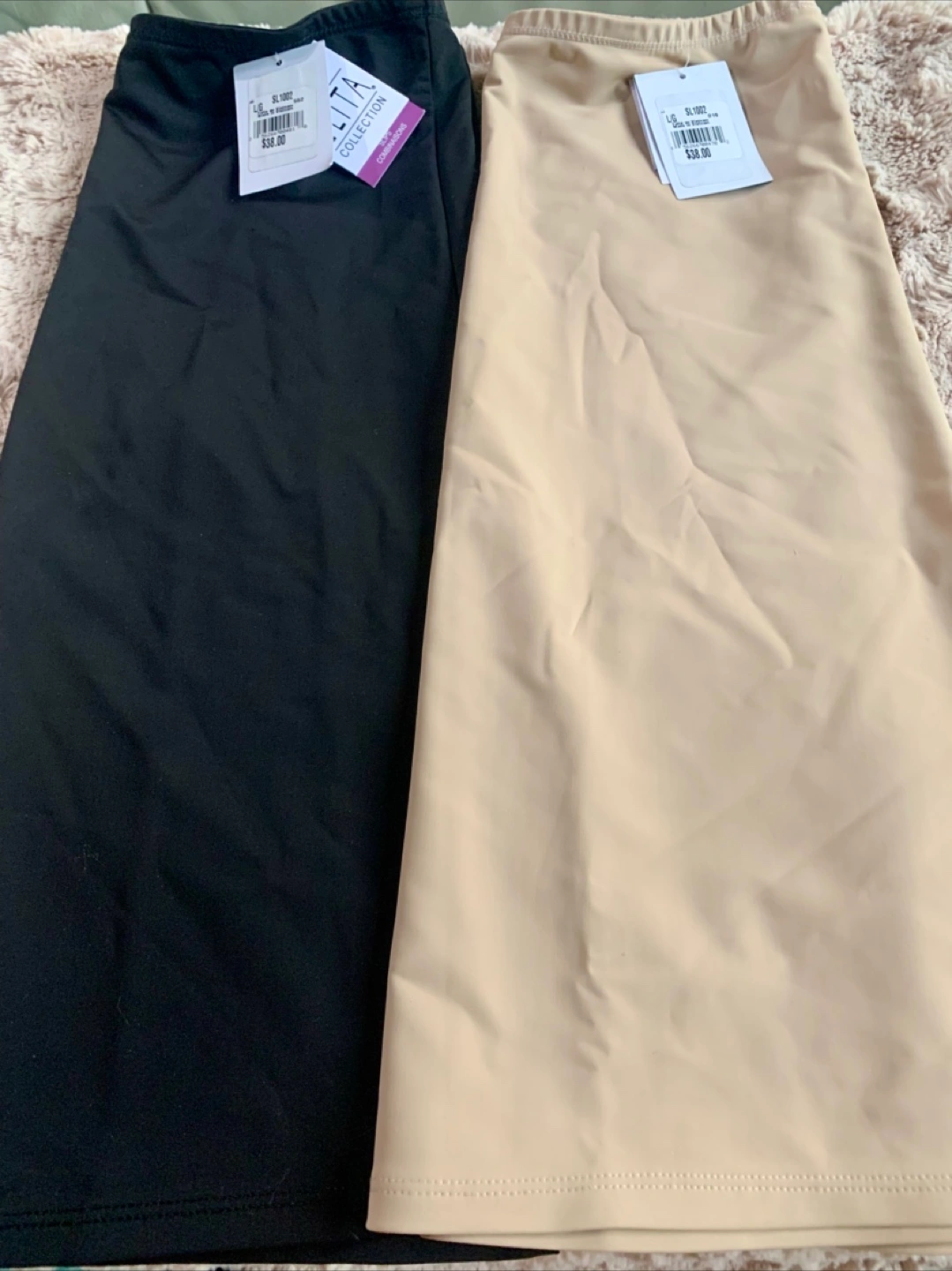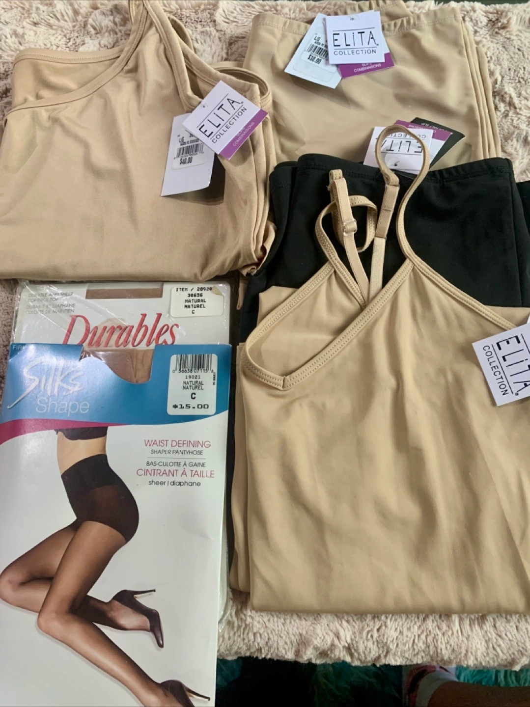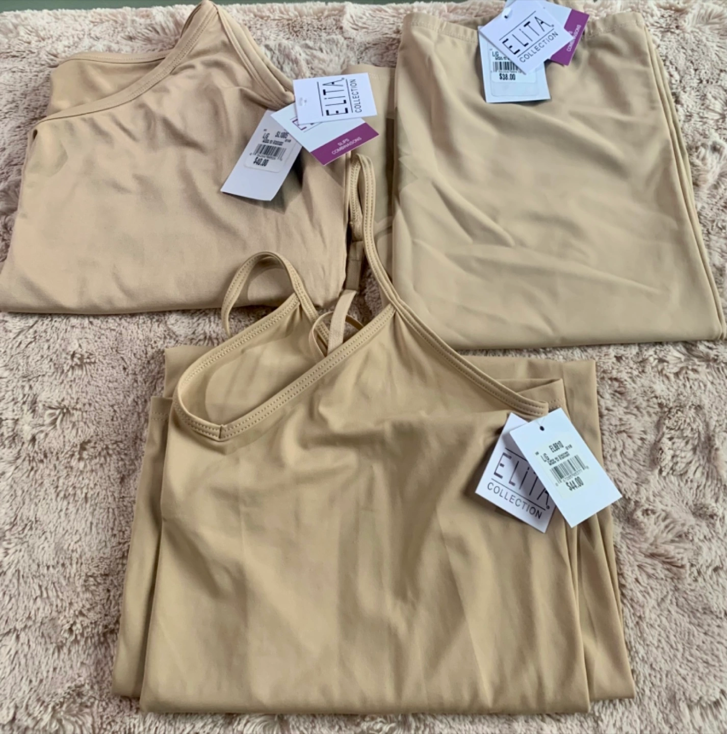 Selling a set of Elita Silk Magic camisoles and skirts! They're a beautiful beige colour and are brand new with tags. Perfect for layering or wearing on their own. The tags show they were originally $46 for the camisoles and $38 for the skirts. The pantyhose are size C and were originally $15
