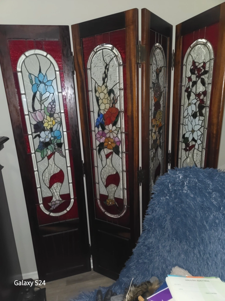 Selling a Antique Custom Beautiful Stained glass folding screen! It's in great condition with minor crack on 1 panel. Thats why I priced it alot less from it actual worth. Retails $1800 US. Its design of the 4 season's is Authentic. Its Dimensions are: 1ft 16.5 in" w x 6ft H.