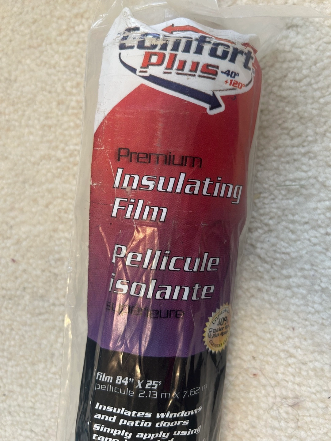 Selling a roll of Comfort Plus Premium Insulating Film. It's designed to insulate windows and patio doors, and it's easy to apply with the included tape. It shrinks crystal clear and helps reduce heat loss while preventing frost and condensation