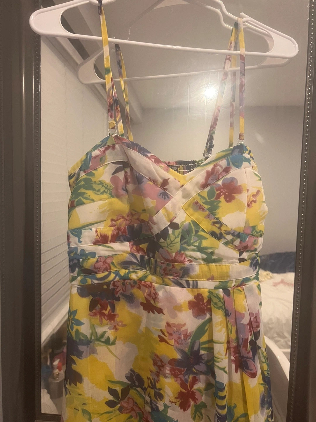 Selling a lovely floral dress from Nylon 76 in size medium! It's in great condition and features a vibrant yellow and white floral pattern. Perfect for a summer day or a special occasion!
