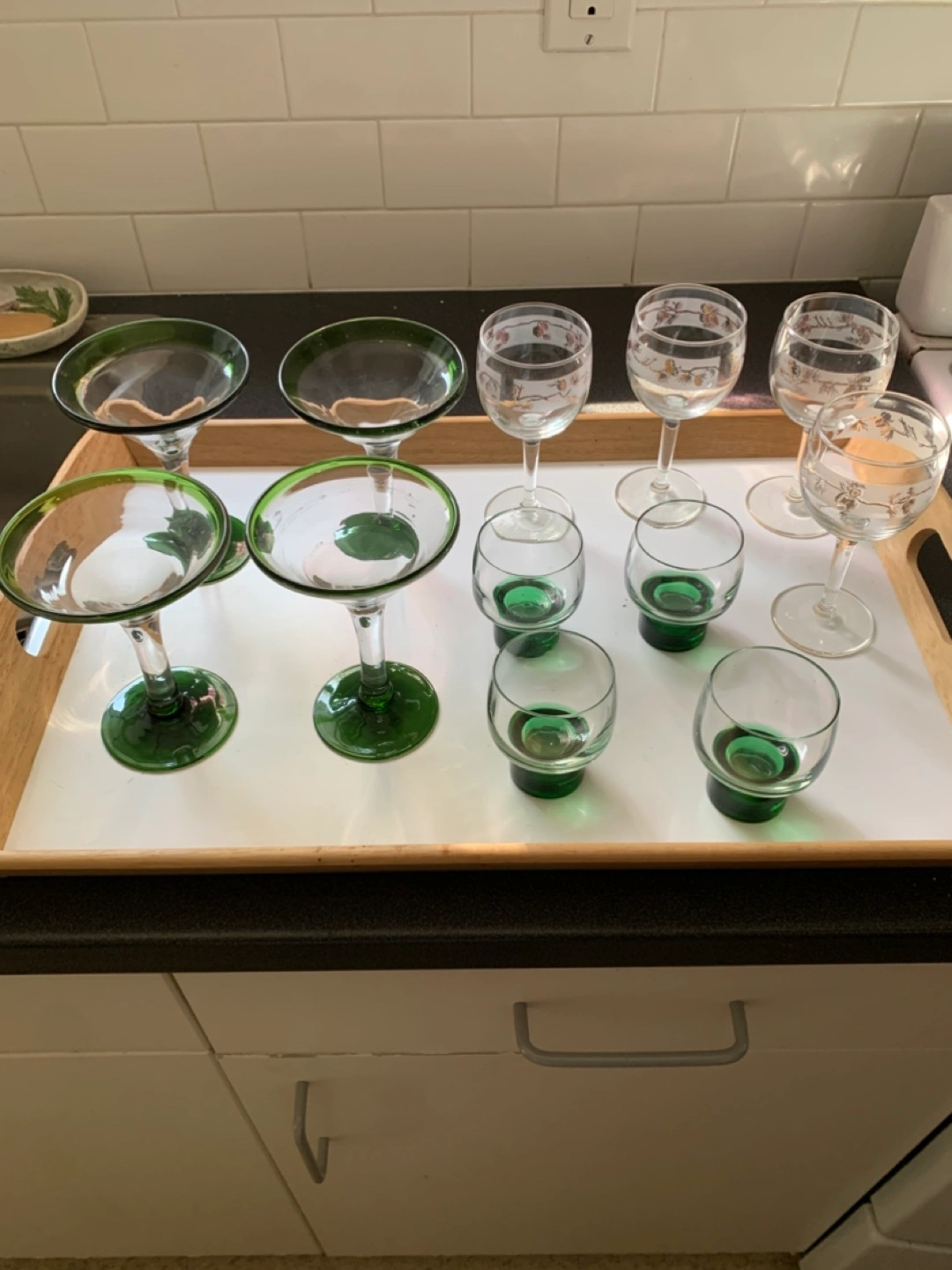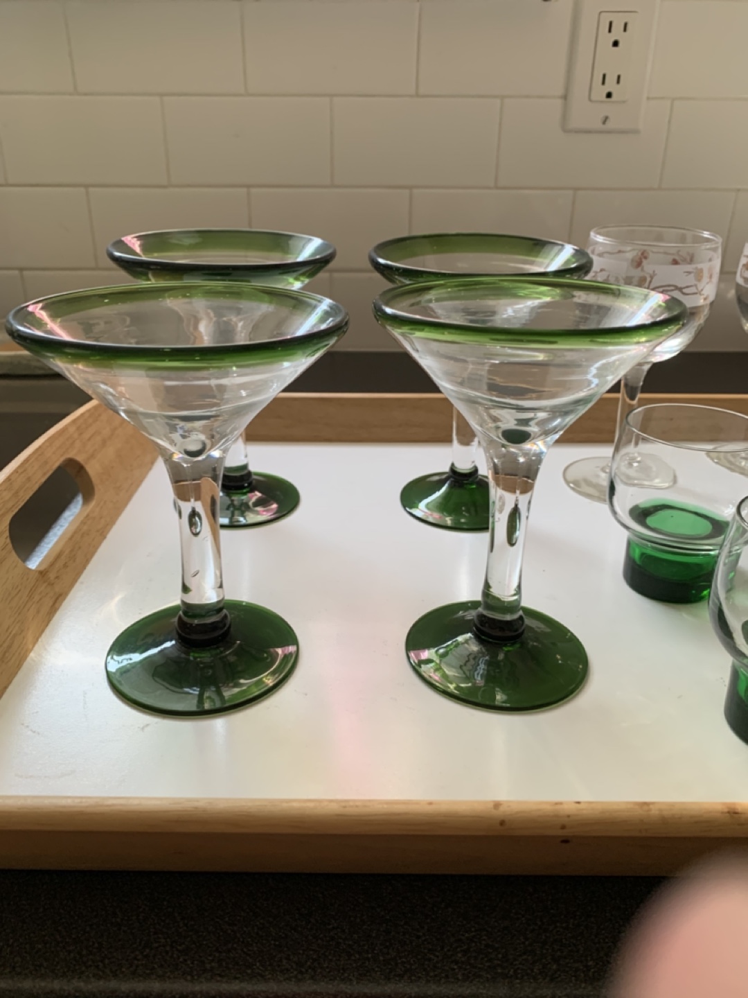 Selling a set of four margarita glasses with a lovely green rim! They're in great shape and ready for your next fiesta or cocktail night. Perfect for adding a touch of fun to your glassware collection