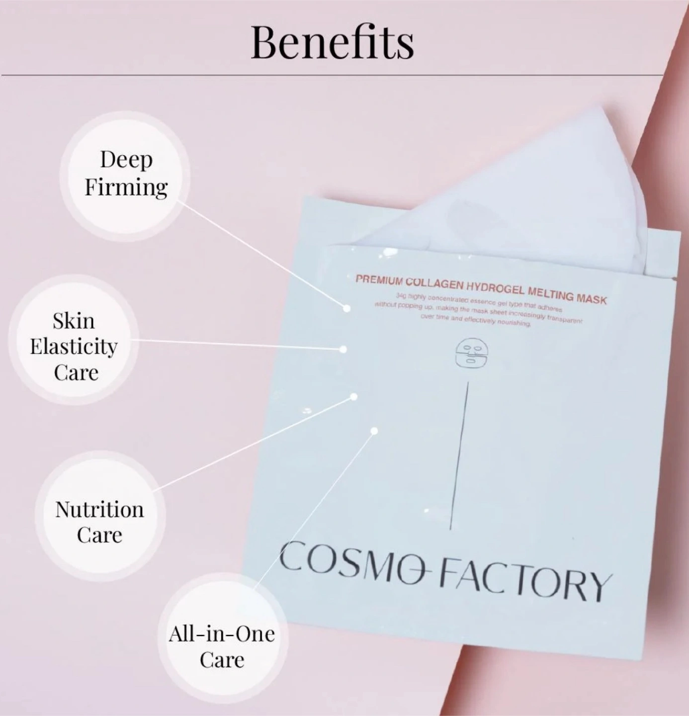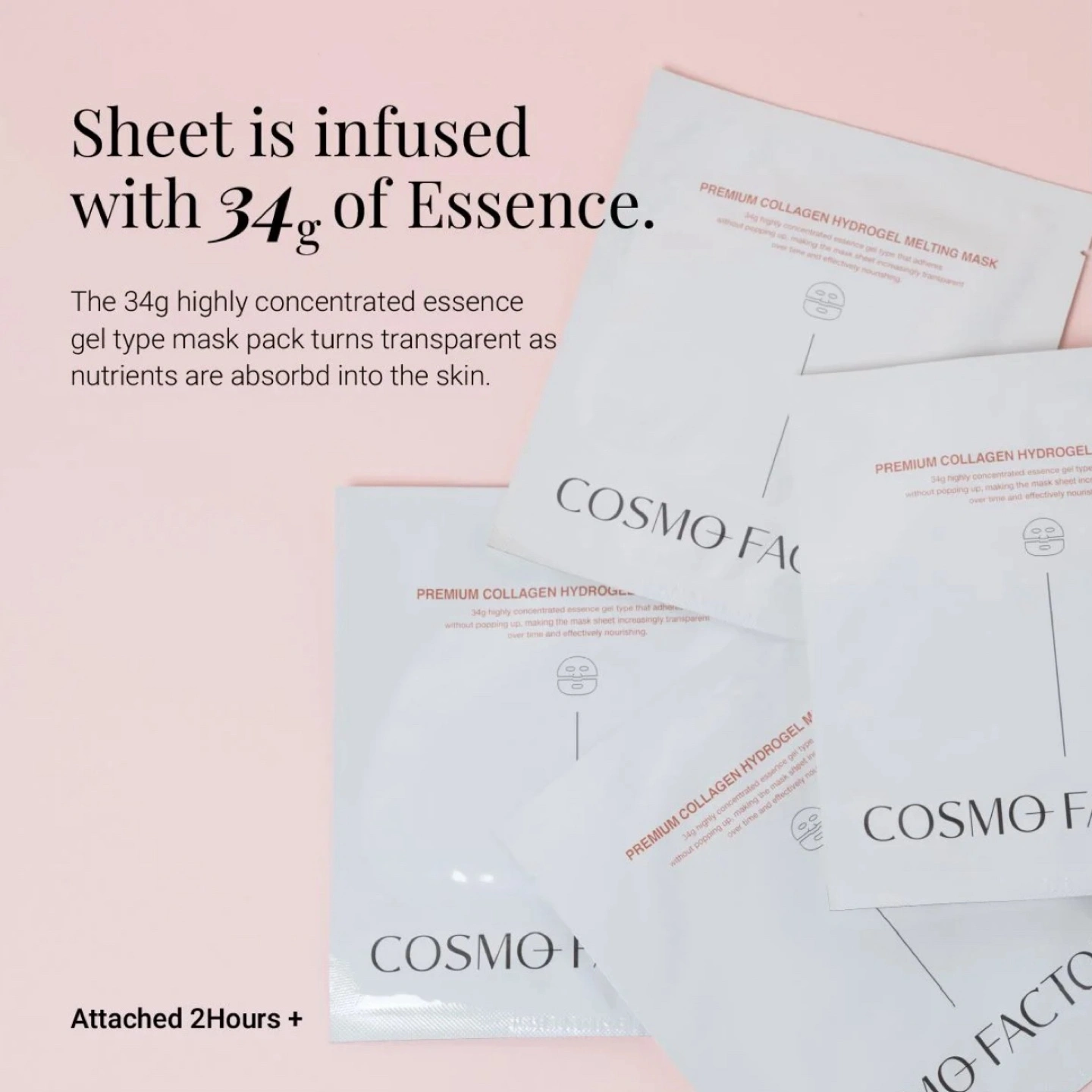 I'm selling Cosmo Factory Premium Collagen Hydrogel Melting Masks. These masks are infused with 34g of essence. The highly concentrated essence gel type mask pack turns transparent as nutrients are absorbed into the skin. They provide deep firming, skin elasticity care, nutrition care, and all-in-one care