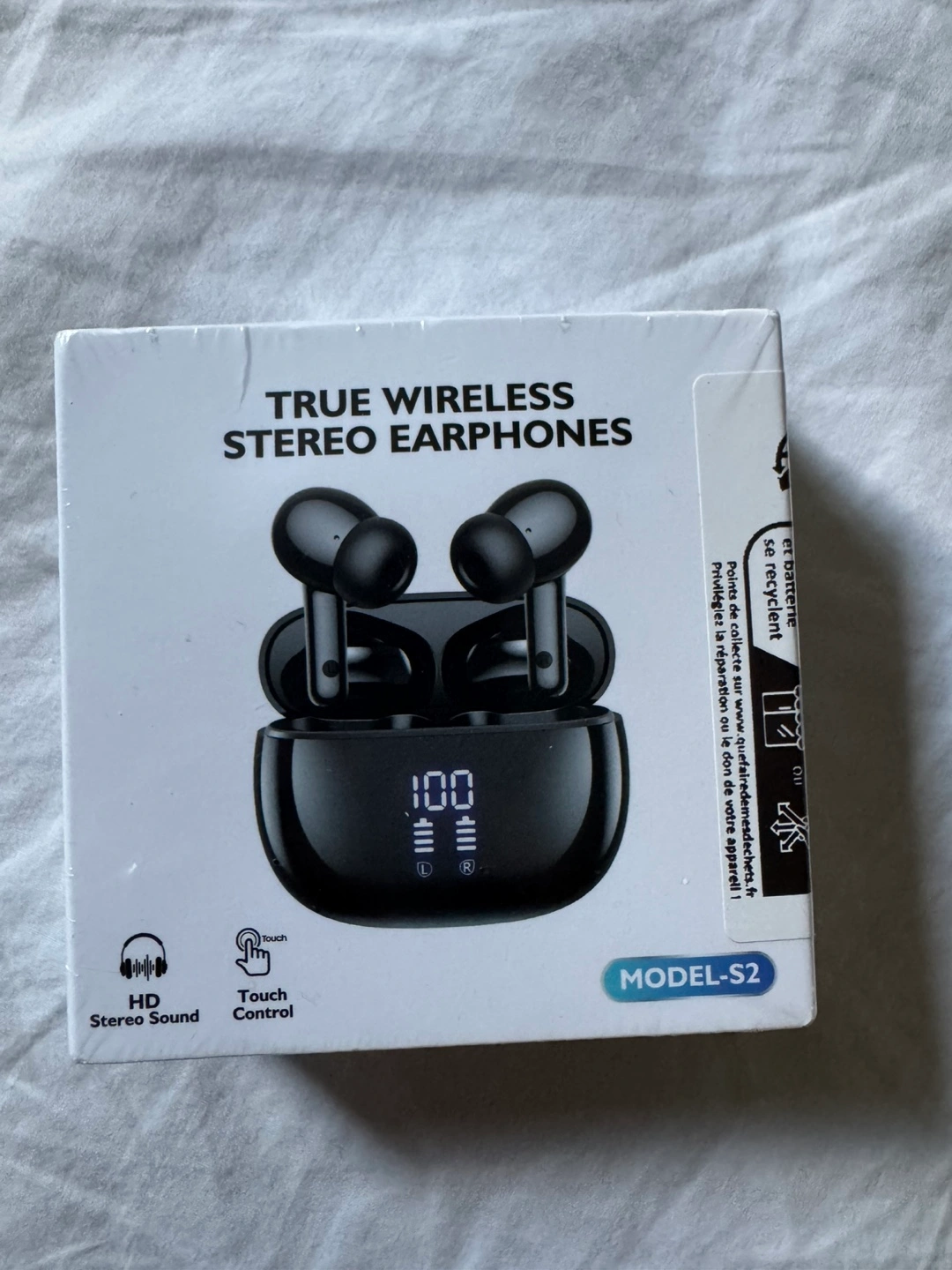 Selling a brand new sealed pair of S2 True Wireless Stereo Earphones! They feature HD stereo sound and touch control, all in a sleek black design. The box includes the earphones and charging case. Great for listening to music or taking calls on the go