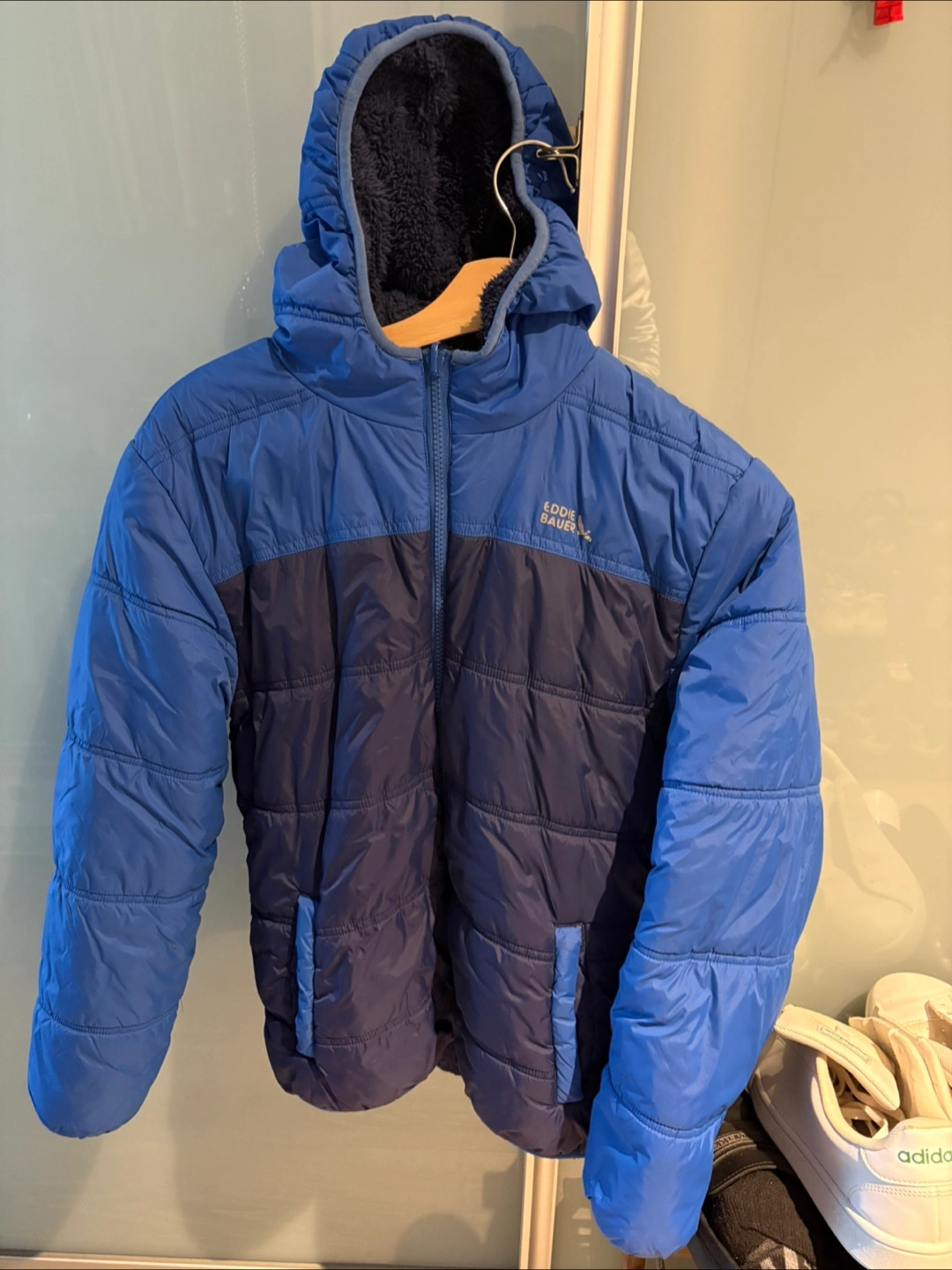Cozy Eddie Bauer puffer jacket in a nice shade of blue! Perfect for keeping warm during those chilly days. It has fur lining inside, a hood and two pockets too! For kids between 9 and 11 years old. Good condition. This jacket has been washed and ready to use!