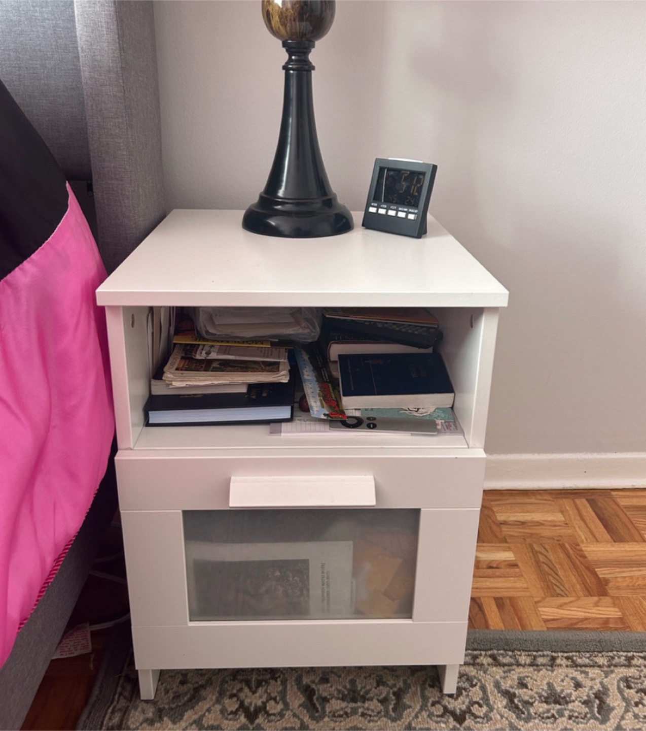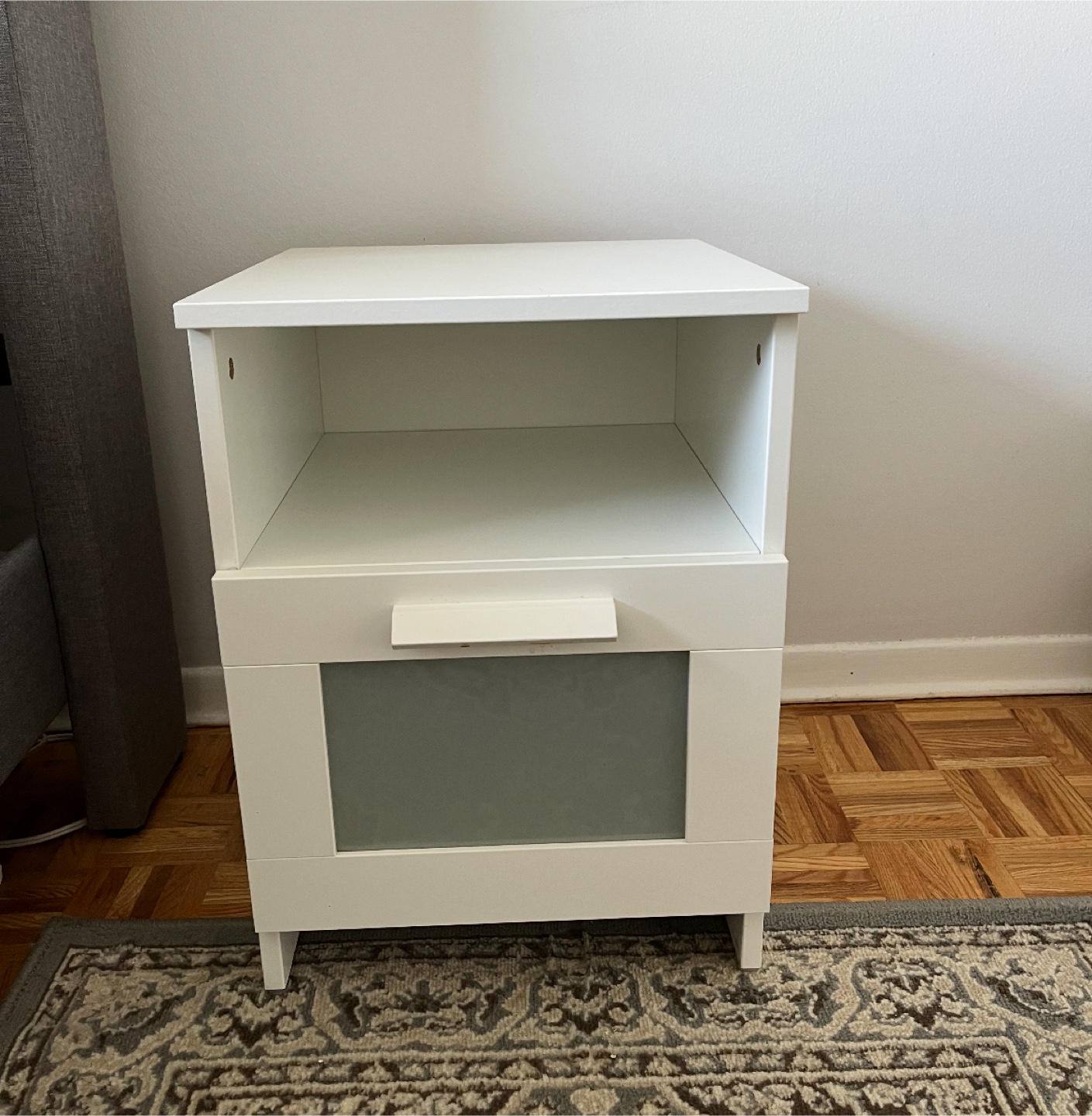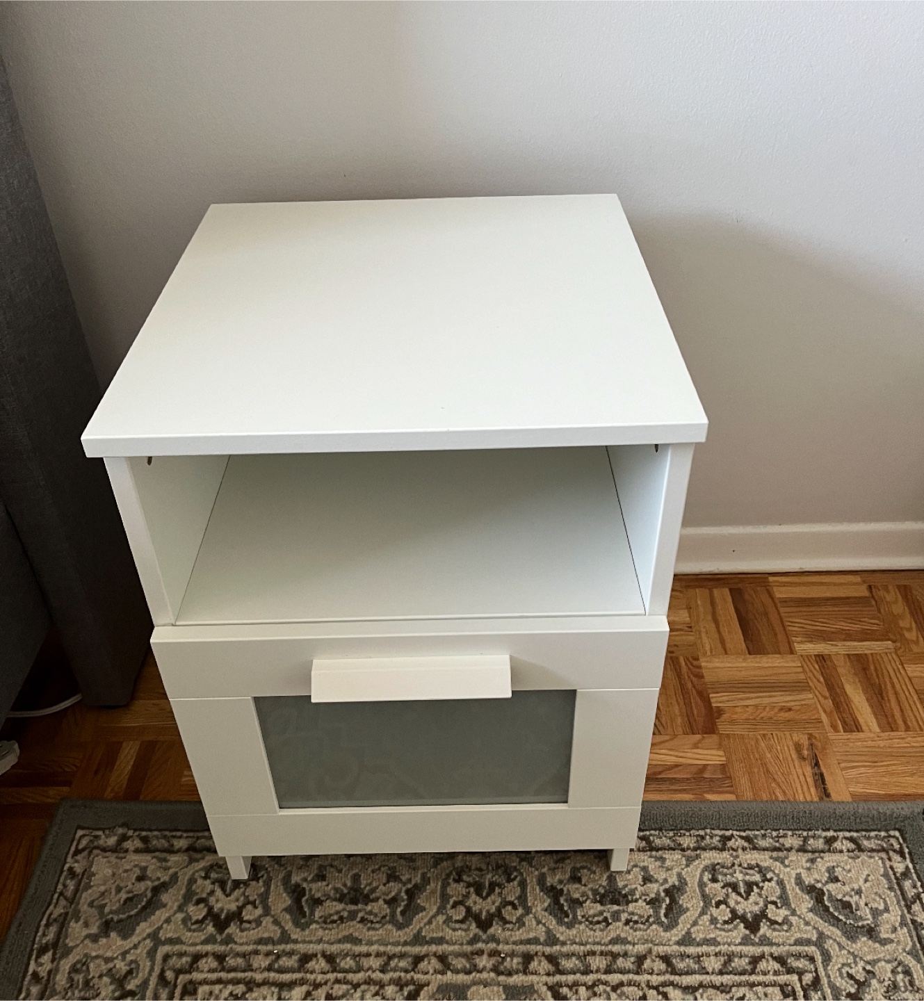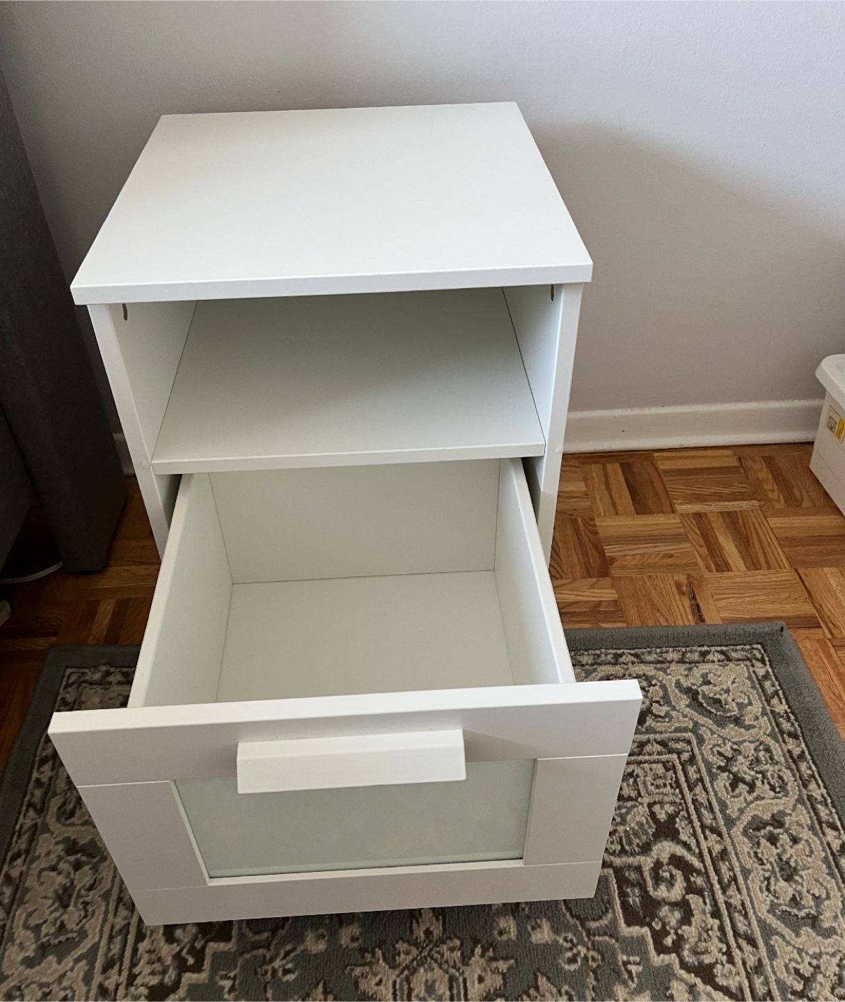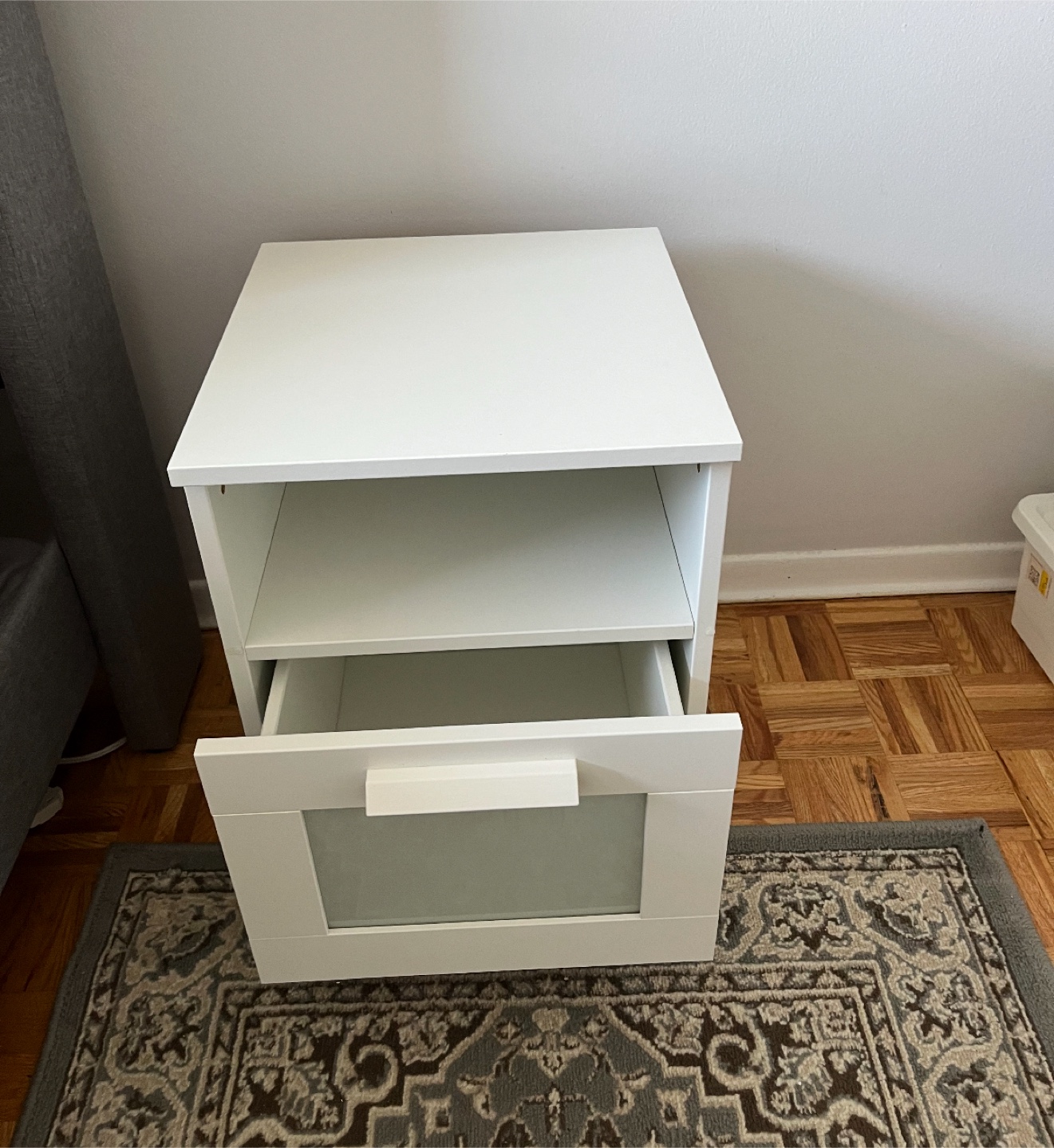 Selling a white bedside table! It has a drawer and an open shelf for storage. Perfect for keeping your books and other essentials close by while you sleep