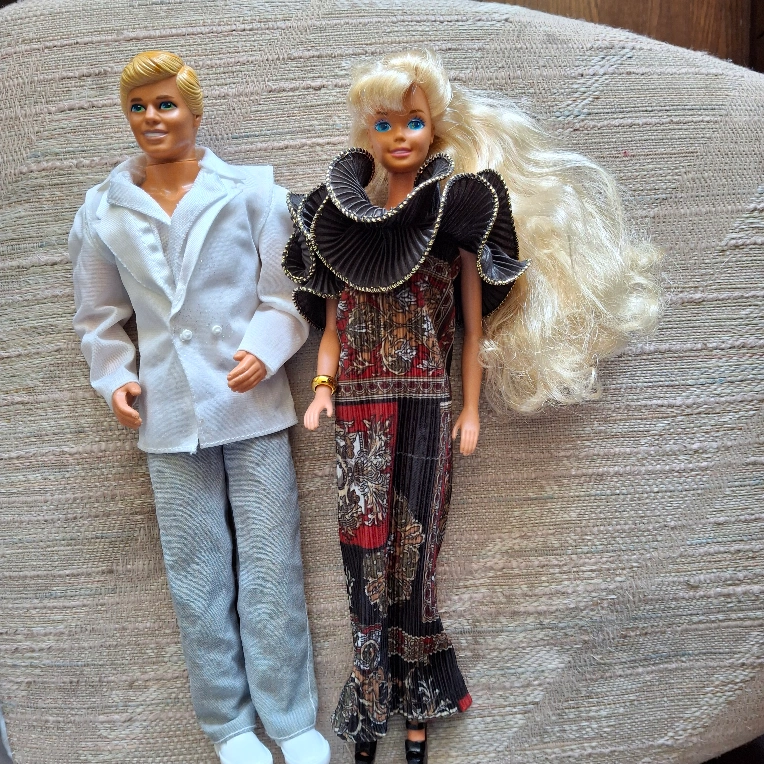 Selling a vintage Barbie and Ken doll set! Barbie is wearing a long, patterned dress with a ruffled collar, and Ken is in a white suit. Perfect for collectors or anyone who loves these classic dolls