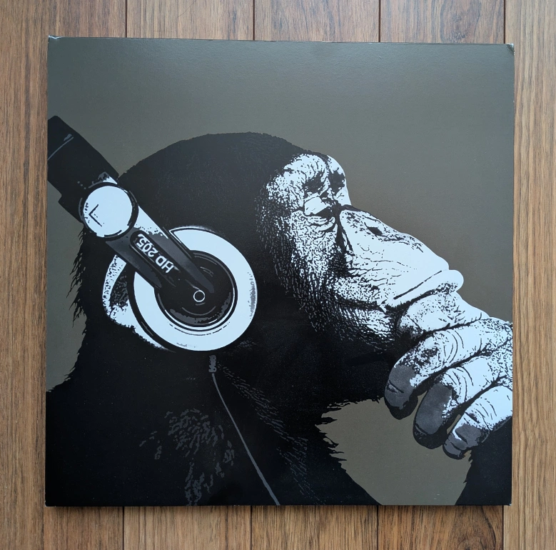 A 16" x 16" framed picture of a chimp wearing headphones.