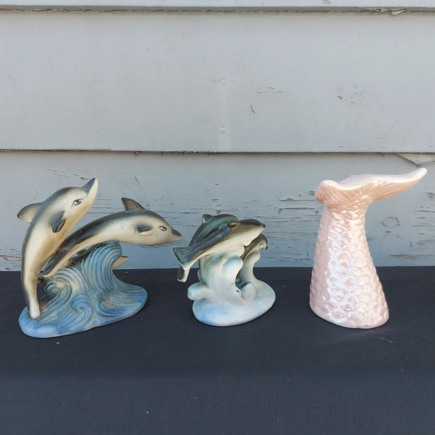 The dolphin figurines are in shades of blue and white, while the mermaid tail has a lovely pink hue
