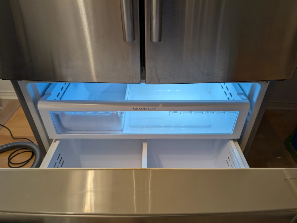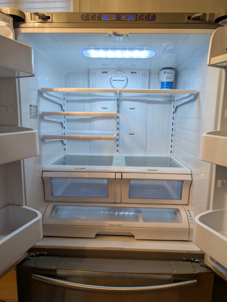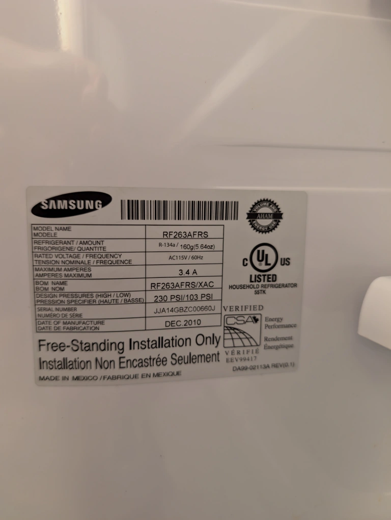 Samsung French door refrigerator, stainless steel, model RF263AFRS, 36" wide, with automatic ice maker. Purchased in 2011. Recently serviced and now works perfectly!