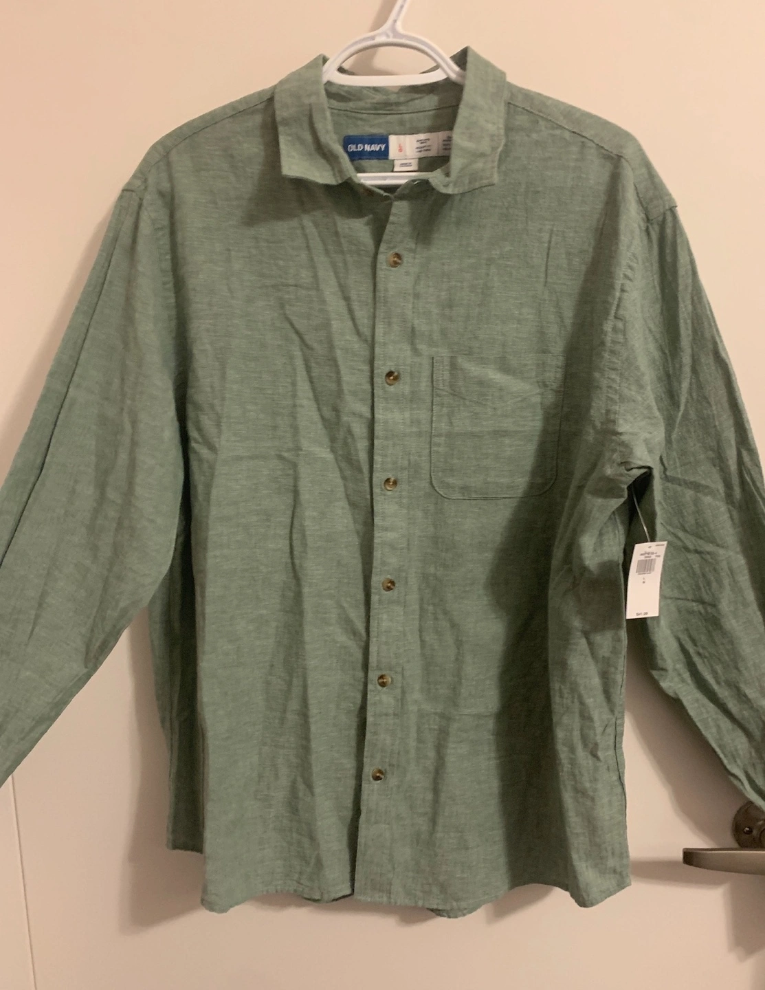 Selling a Linen button-down shirt in size large. The colour is a nice, subtle green. Originally bought for $41.99. Brand new, with tags.