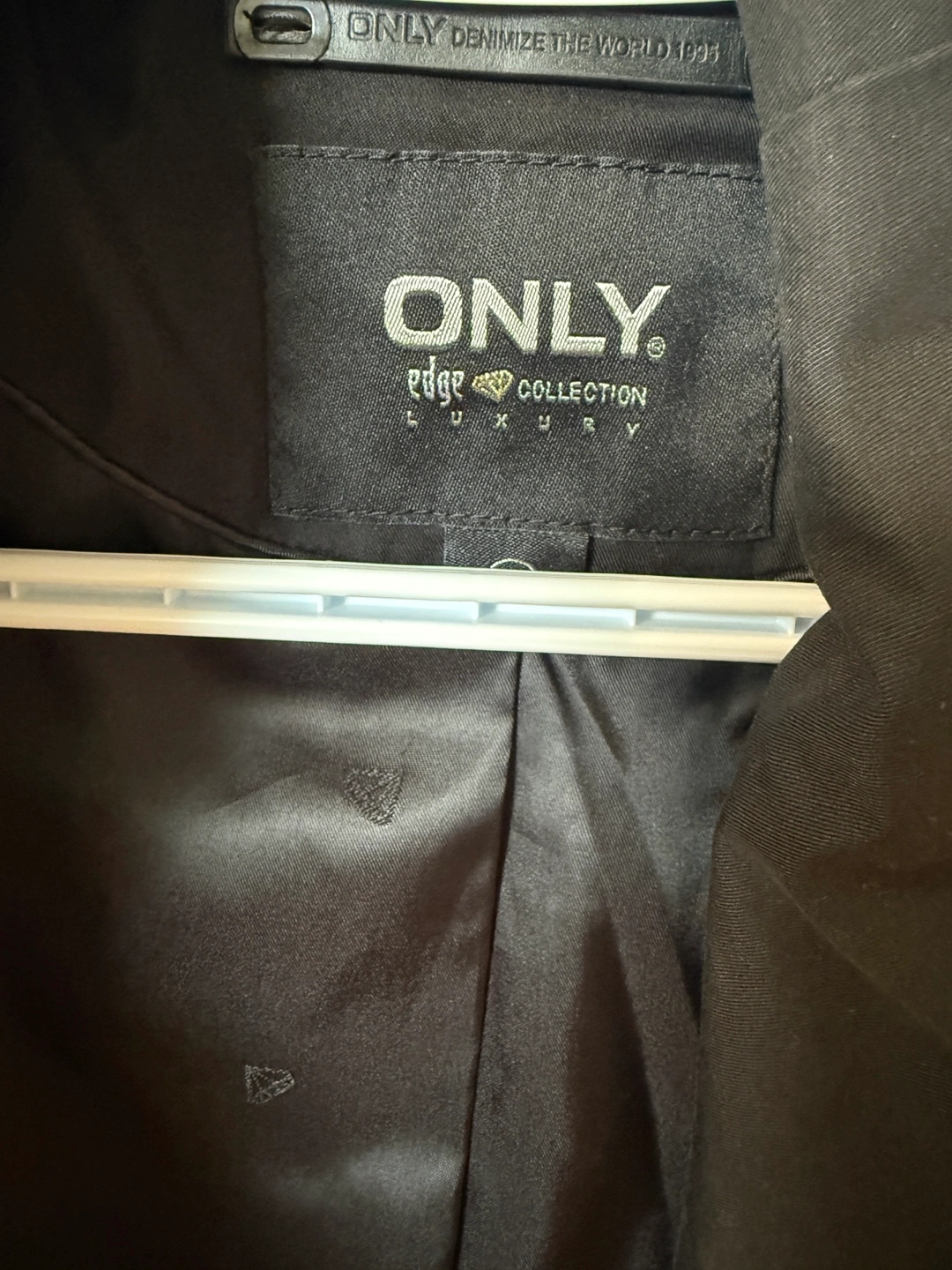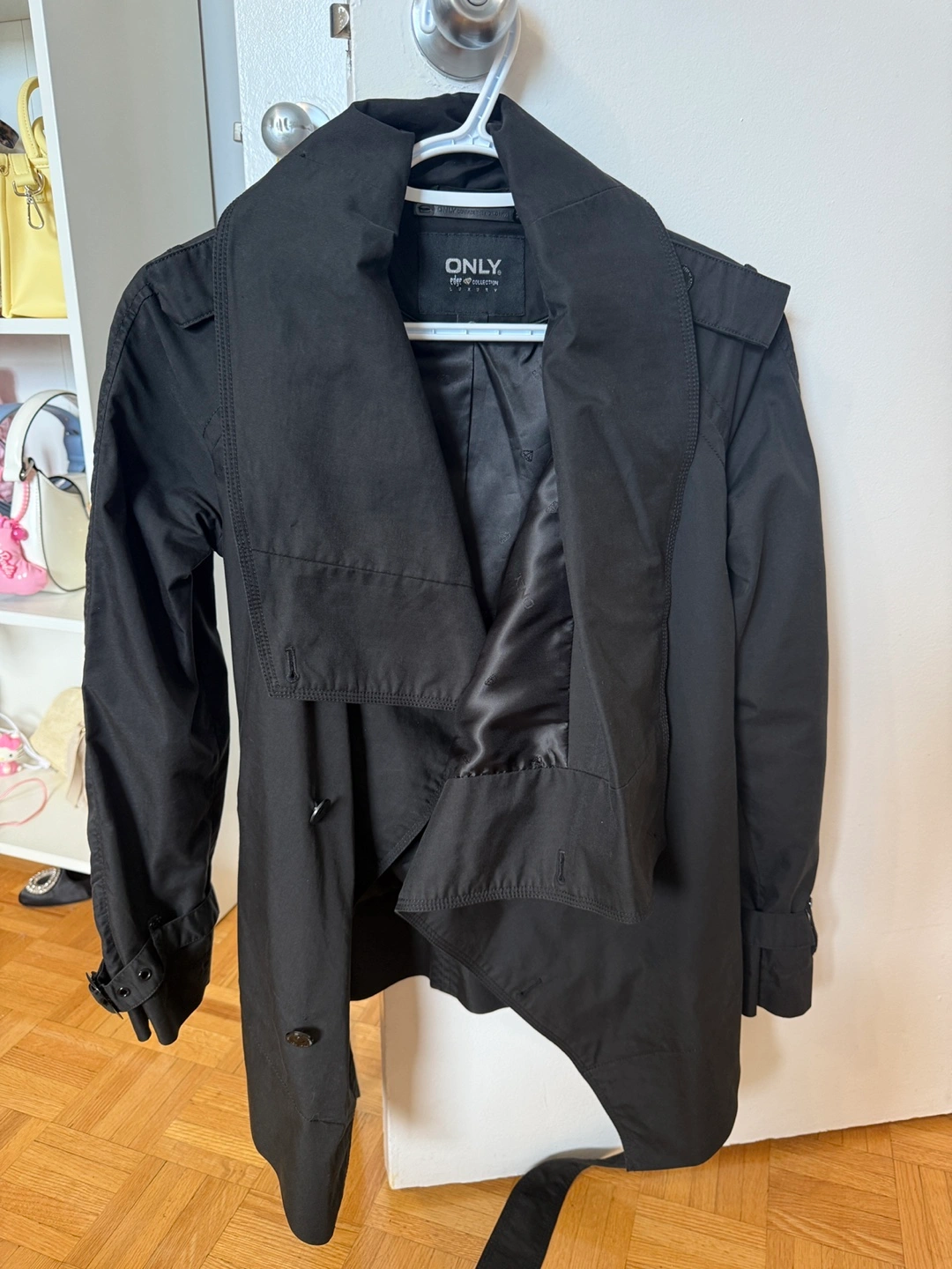 Selling a stylish black trench coat from ONLY's Edge Collection in size M. It's in great condition and ready to add a touch of sophistication to your wardrobe. The coat features a unique asymmetrical design and adjustable sleeve straps. Perfect for those cool autumn days!