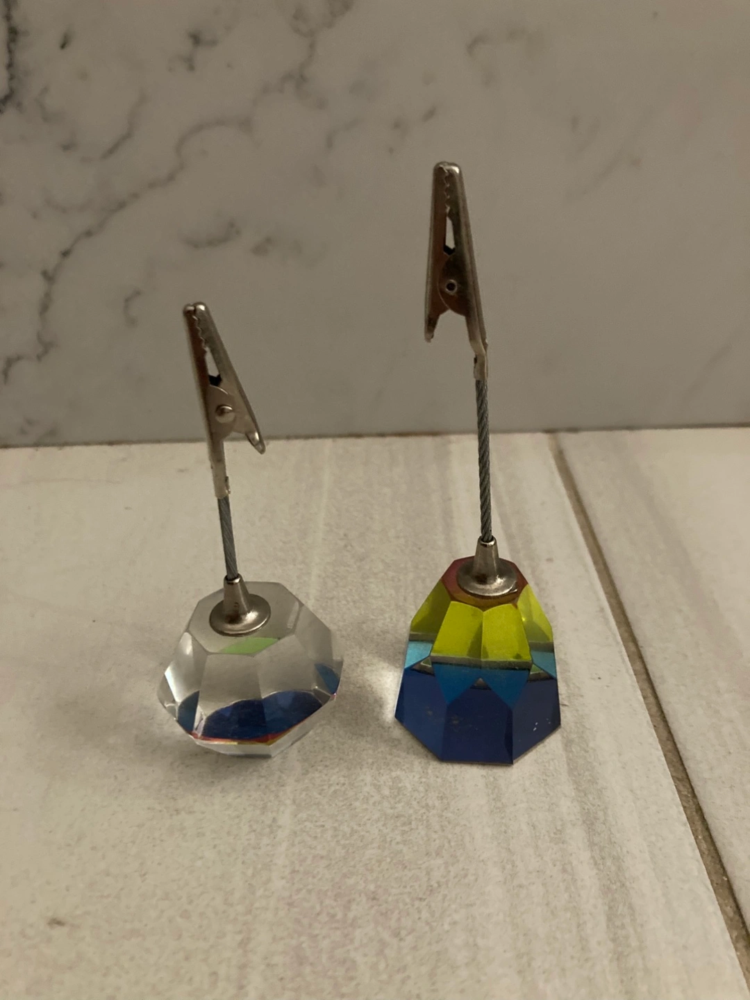 Two glass place card holders for your table setting or event or can hold photos. They're in good condition and ready to add a touch of elegance to your space