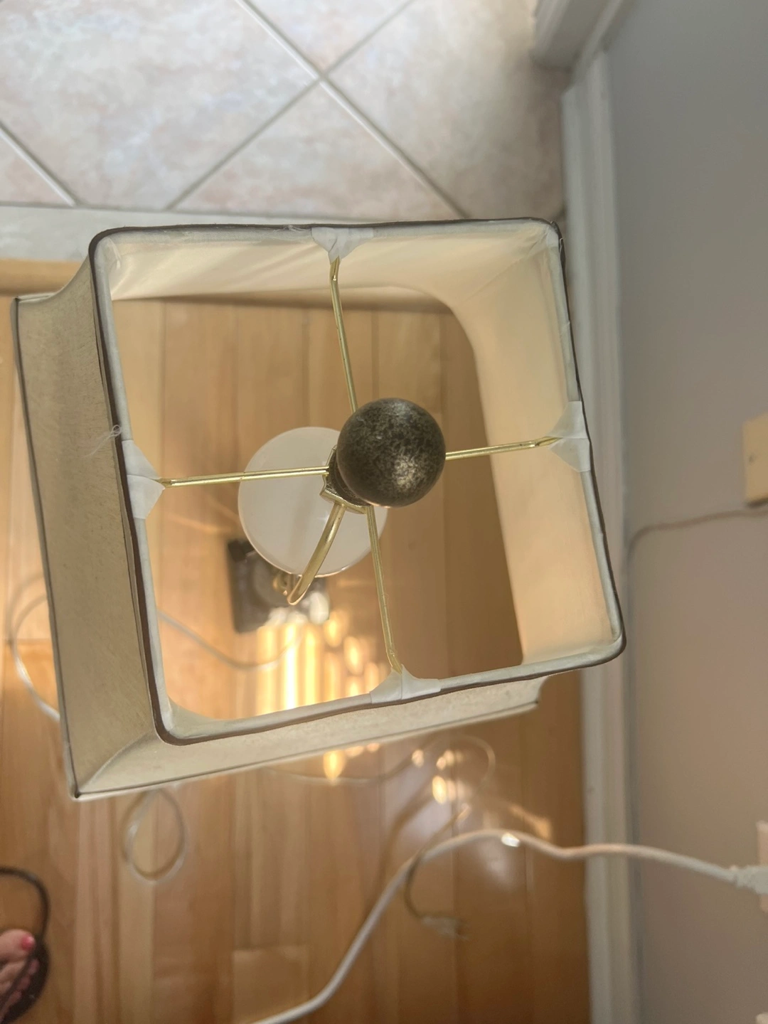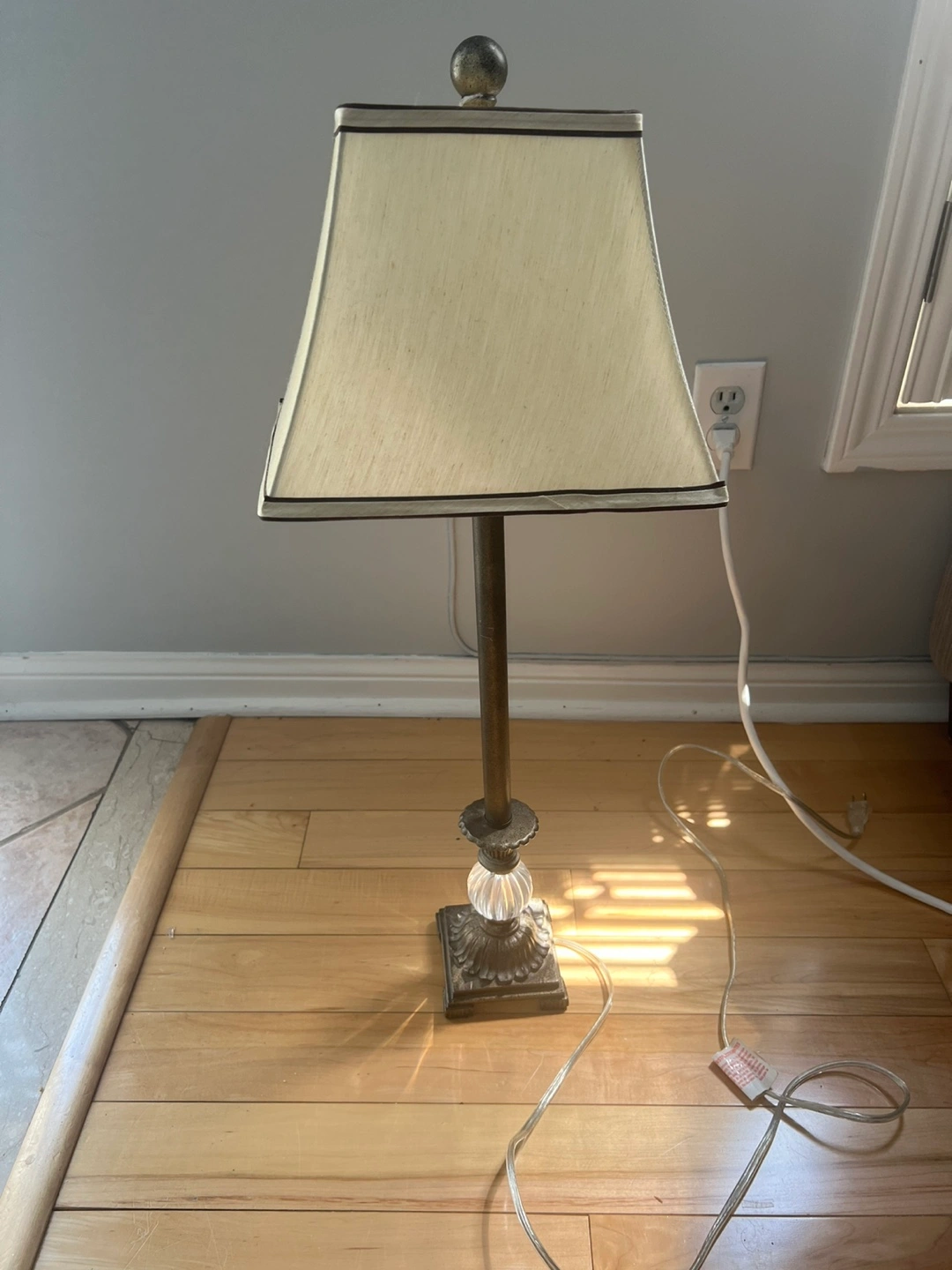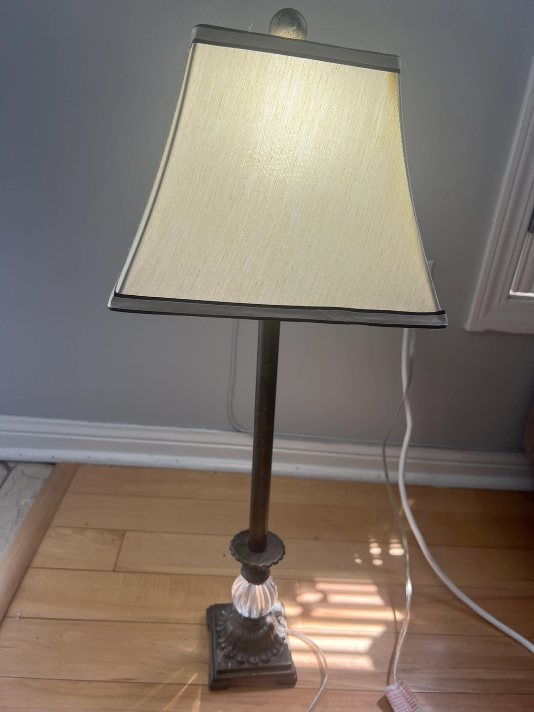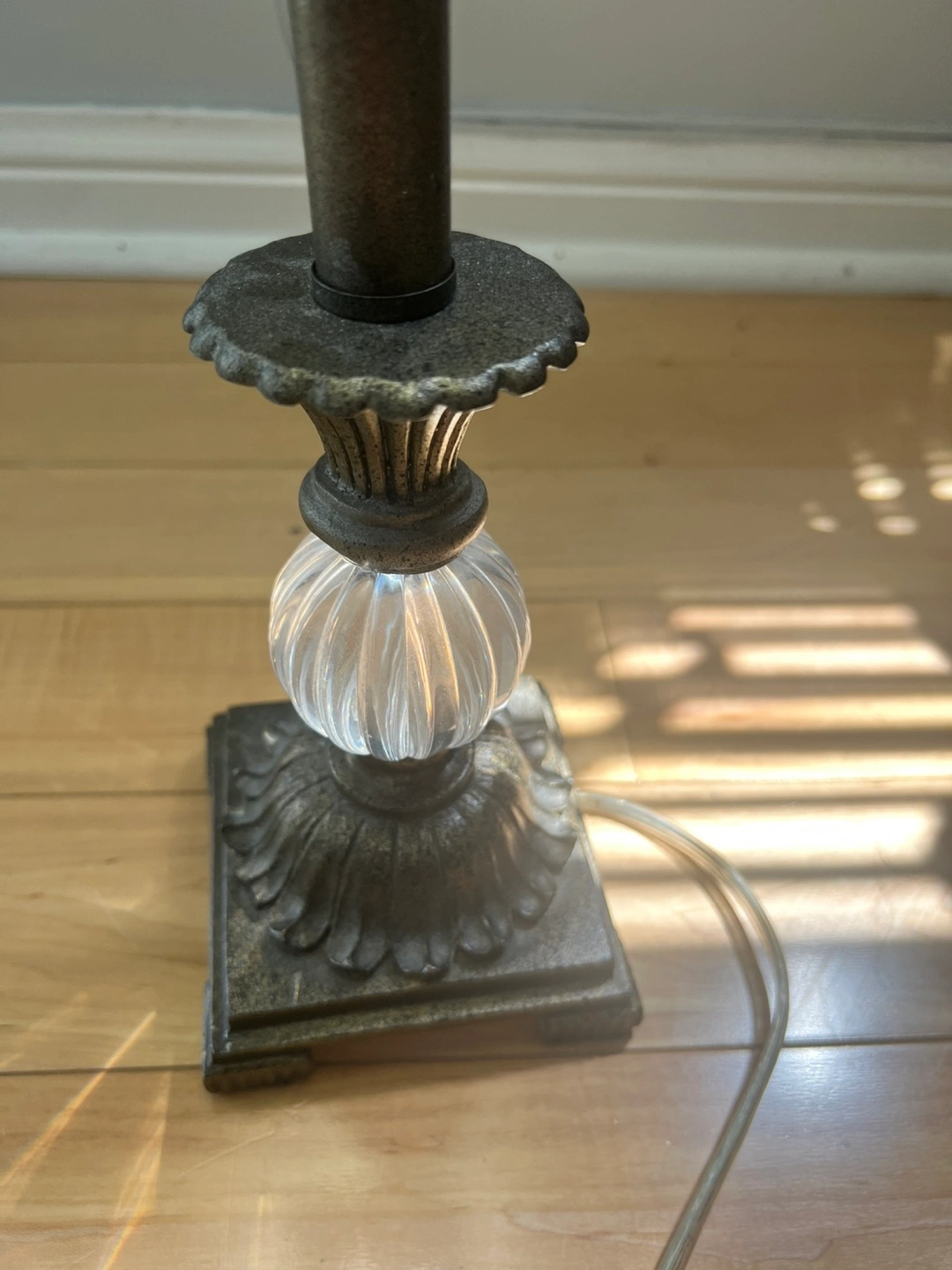 Selling a table lamp with a beige shade. It has a decorative base with a clear glass accent. It's in great condition and would look lovely in any room
