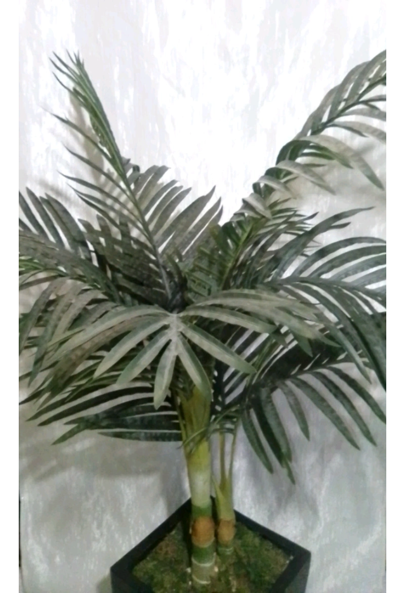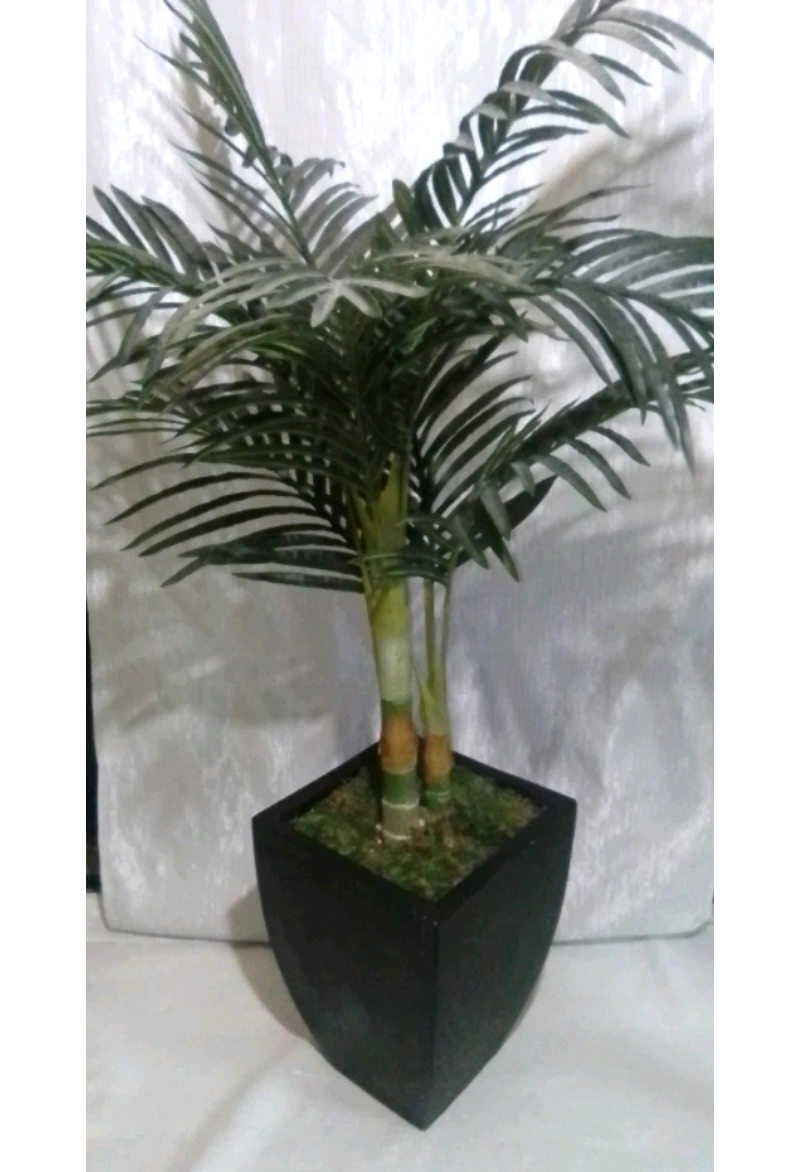 Artificial palm tree in a modern black pot. This faux plant adds a touch of greenery to any space without the maintenance of a real plant. Perfect for home or office decor!