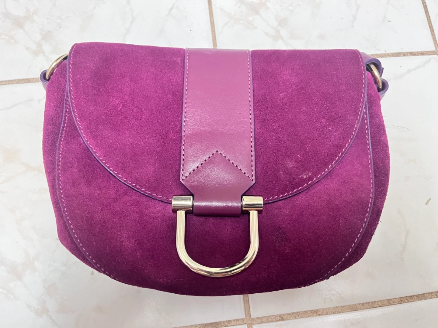 Selling a lovely purple suede crossbody bag! It's in great condition and would be a stylish addition to any outfit. The bag features a unique gold-tone D-ring detail and a comfortable crossbody strap. Perfect for carrying your essentials while keeping your hands free