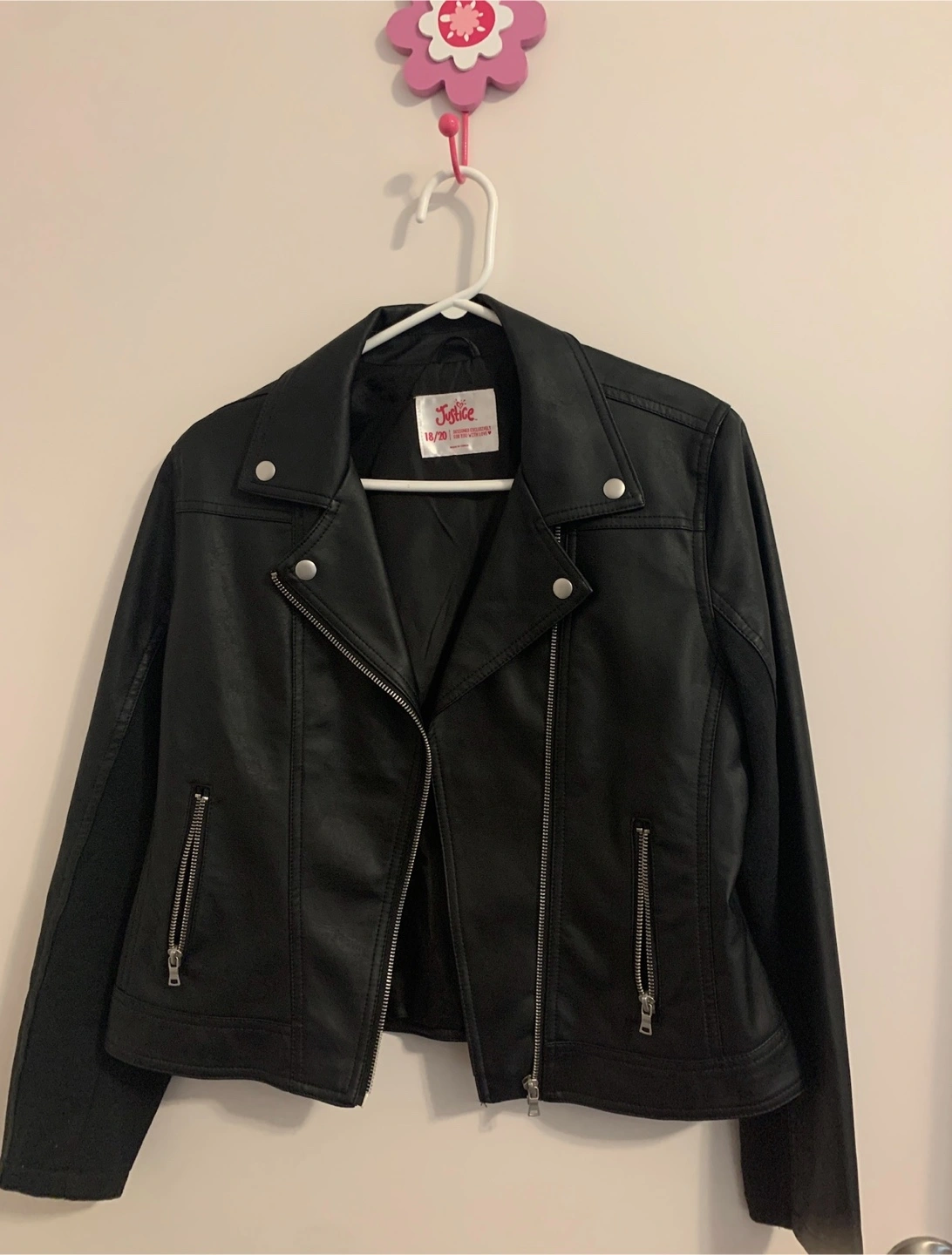 Selling a Justice vegan leather jacket in size 18/20 (Size XL in girls). It's in perfect condition and would be a stylish addition to any wardrobe!