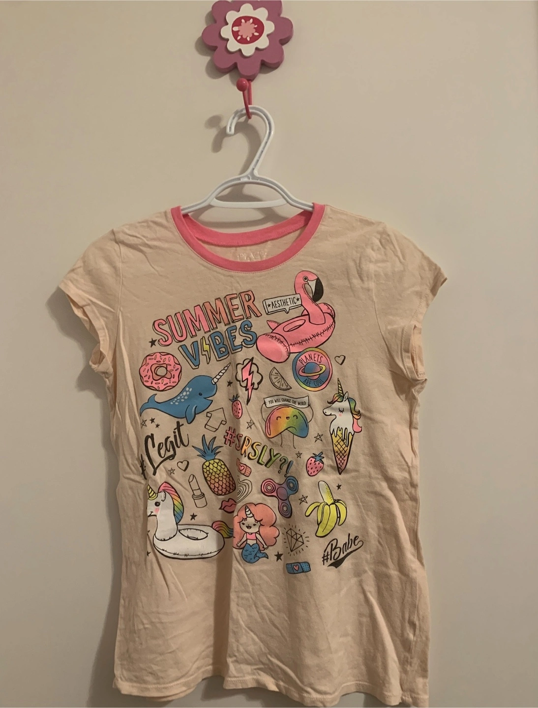 Cute graphic tee for girls! Features fun summer vibes and trendy designs like unicorns, flamingos, and donuts. Perfect for casual wear and adding a pop of fun to any outfit! Gently used. Size: XL (in girls)