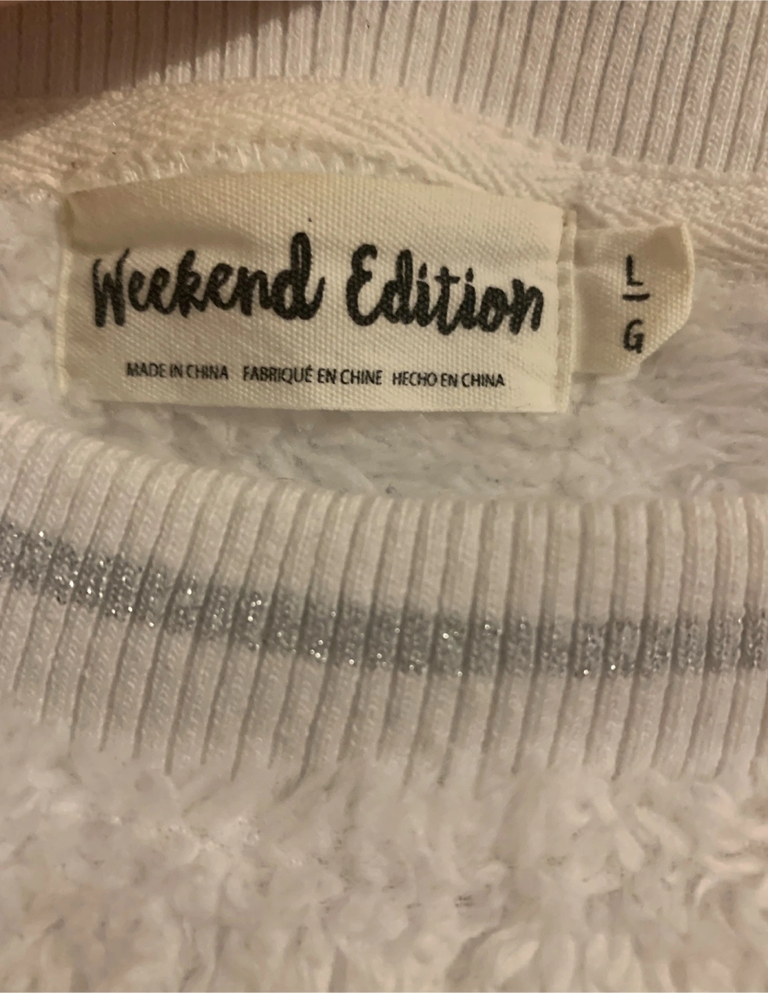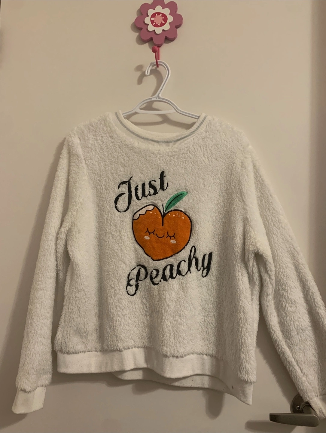 Cozy up in this adorable Weekend Edition sweater! It's a soft, fuzzy white with a cute 'Just Peachy' design. Gently used. Size: L