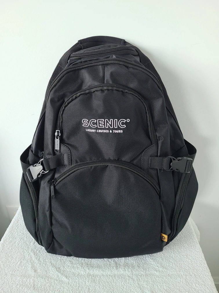 This is a Scenic Luxury Cruises & Tours black backpack, perfect for carrying your essentials while traveling or for everyday use. It's new and ready for its next adventure!