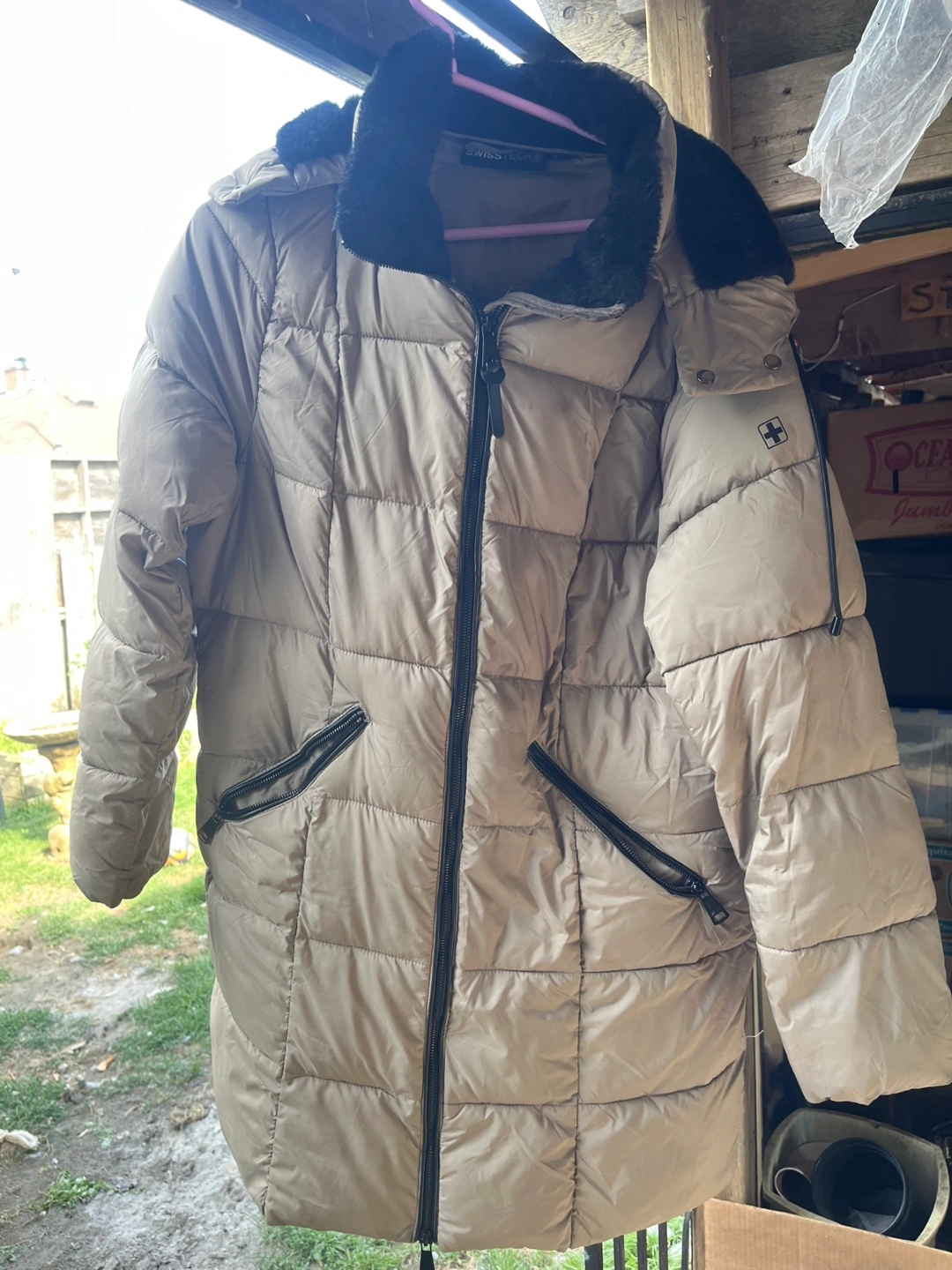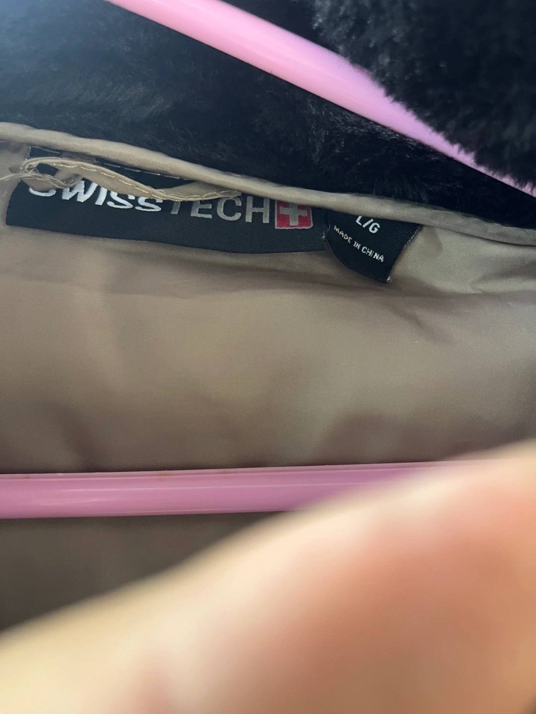 58Selling a Swiss Tech puffer jacket in size large. It's in great condition and ready to keep you warm this winter. The jacket features a stylish design with black accents and a faux fur trim around the hood. Perfect for those chilly Canadian days!