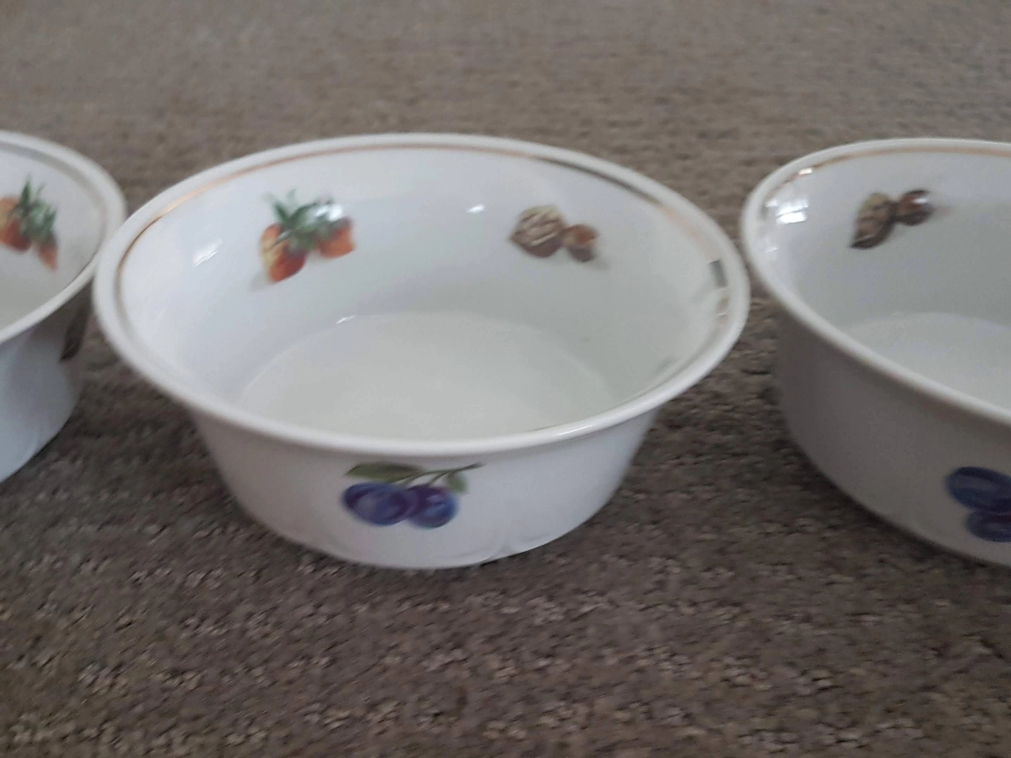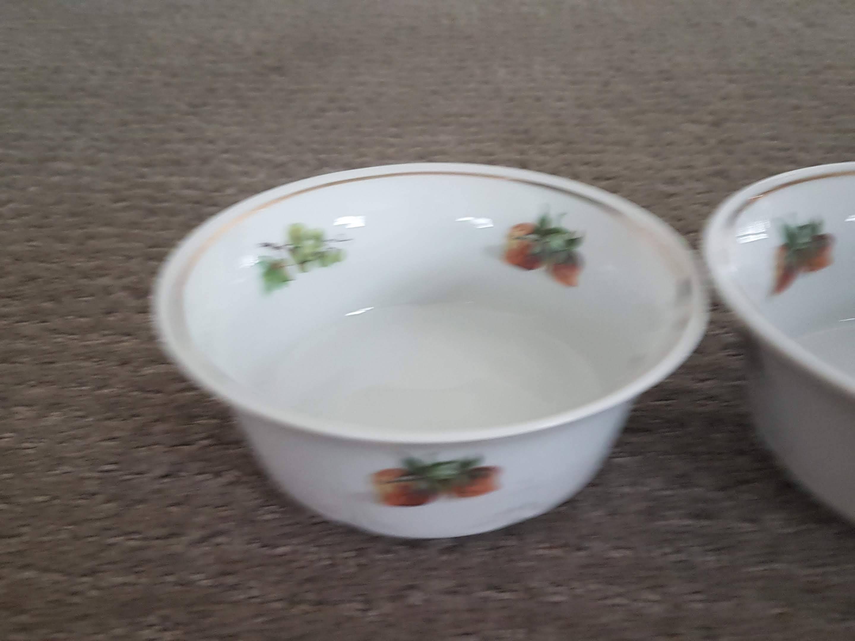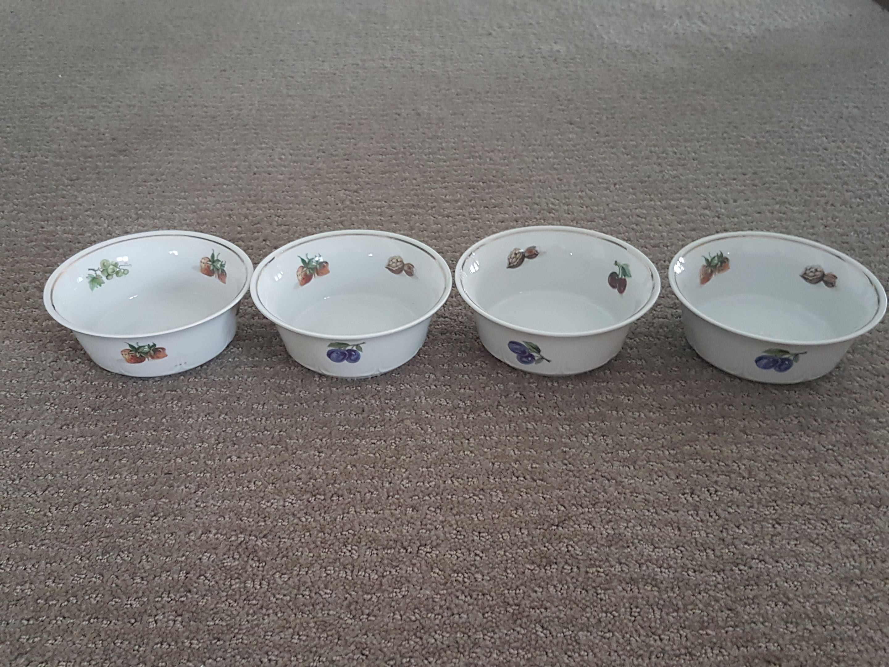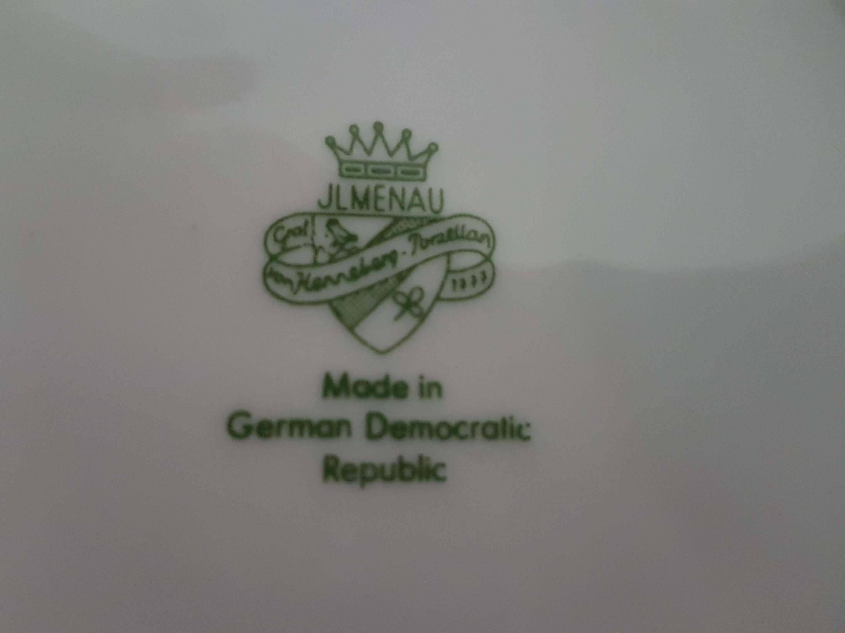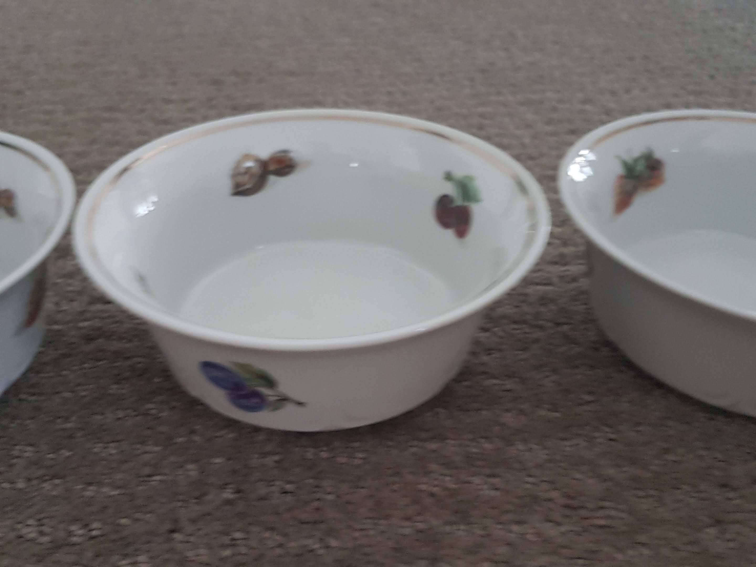 I am selling Vintage J L Menau Porcelain Bowls in great condition. Vintage J L Menau Porcelain Bowls manufactured by Jlmenau, von Henneberg in the German Democratic Republic. White with fruits and walnut on the inside and fruit on the outside. Embossed pattern around base, gold trim. No chips or cracks.