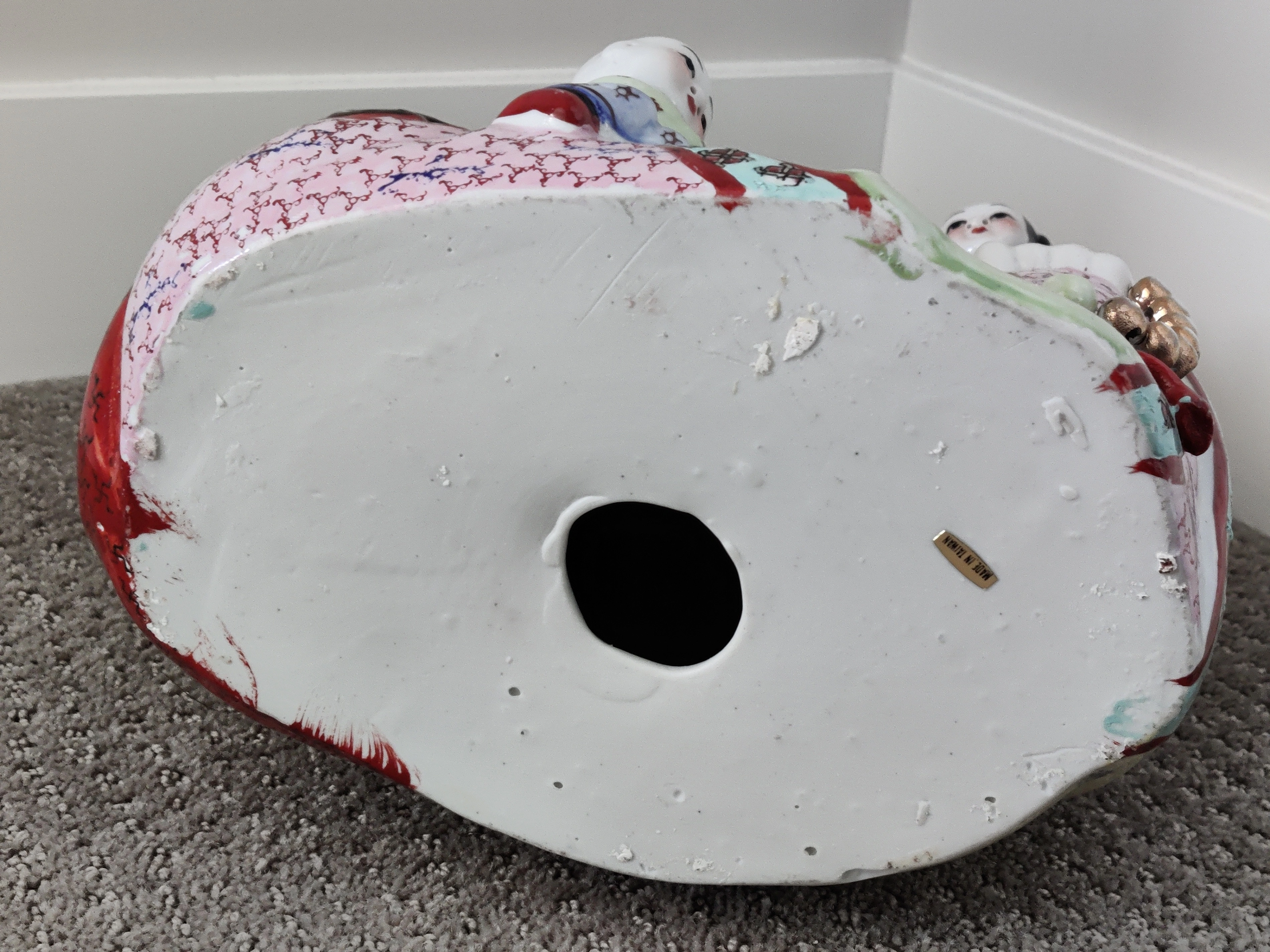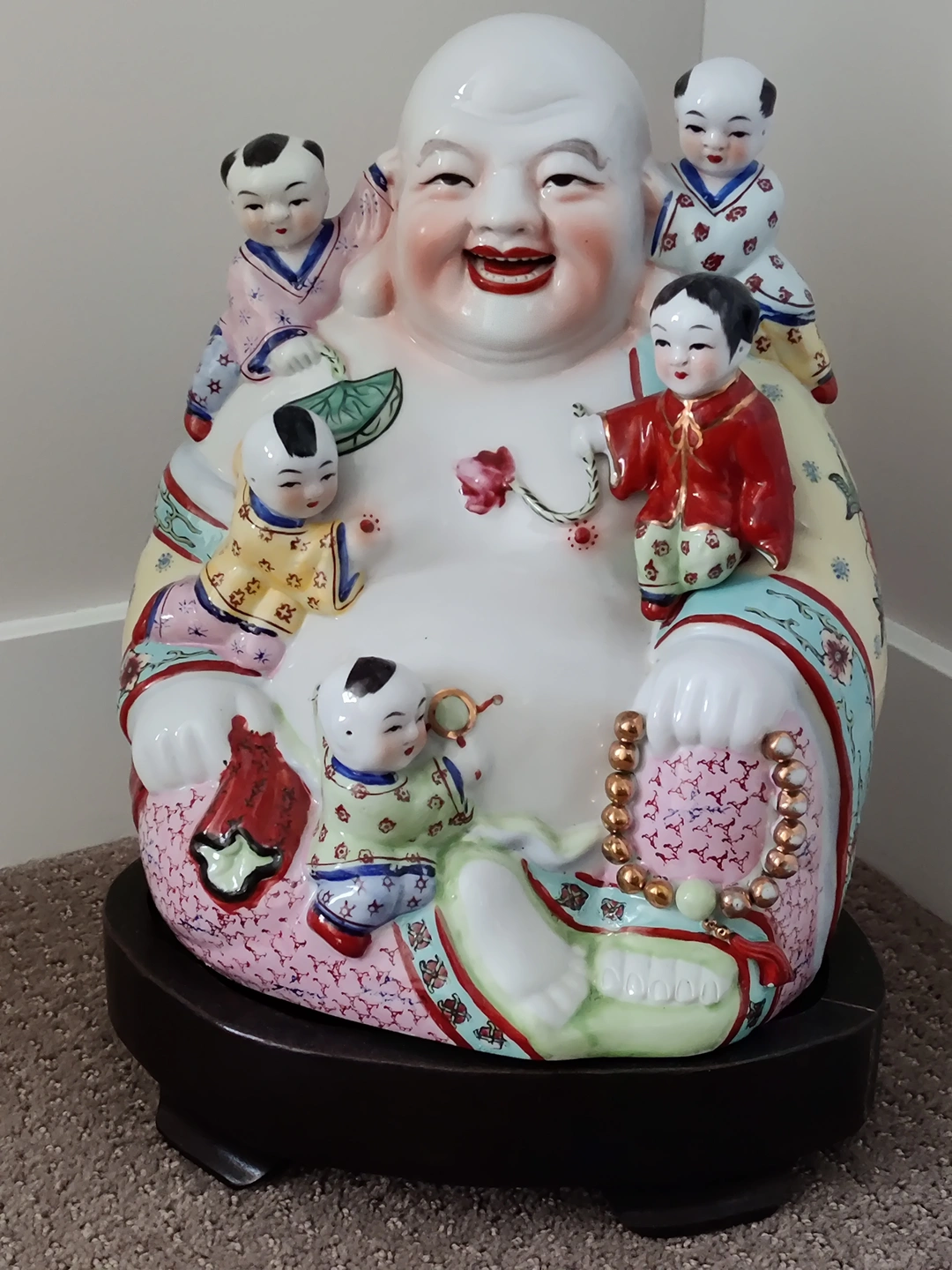 I am selling an Antique Chinese Porcelain Famille Rose Buddha Statue with 5 Children in excellent condition. No chips or cracks. The wooden stand is made from heavy solid wood, some wear in the wooden stand, but overall in great condition. This is a magnificent antique Chinese porcelain statue, a beautiful and heartwarming depiction of the "Laughing Buddha," also known as Budai, surrounded by five joyful children. This piece is a superb example of Famille Rose enamel work, known for its soft color palette and intricate detail. The statue is in excellent condition, with no chips or cracks, and is presented on its original, heavy solid wood stand.