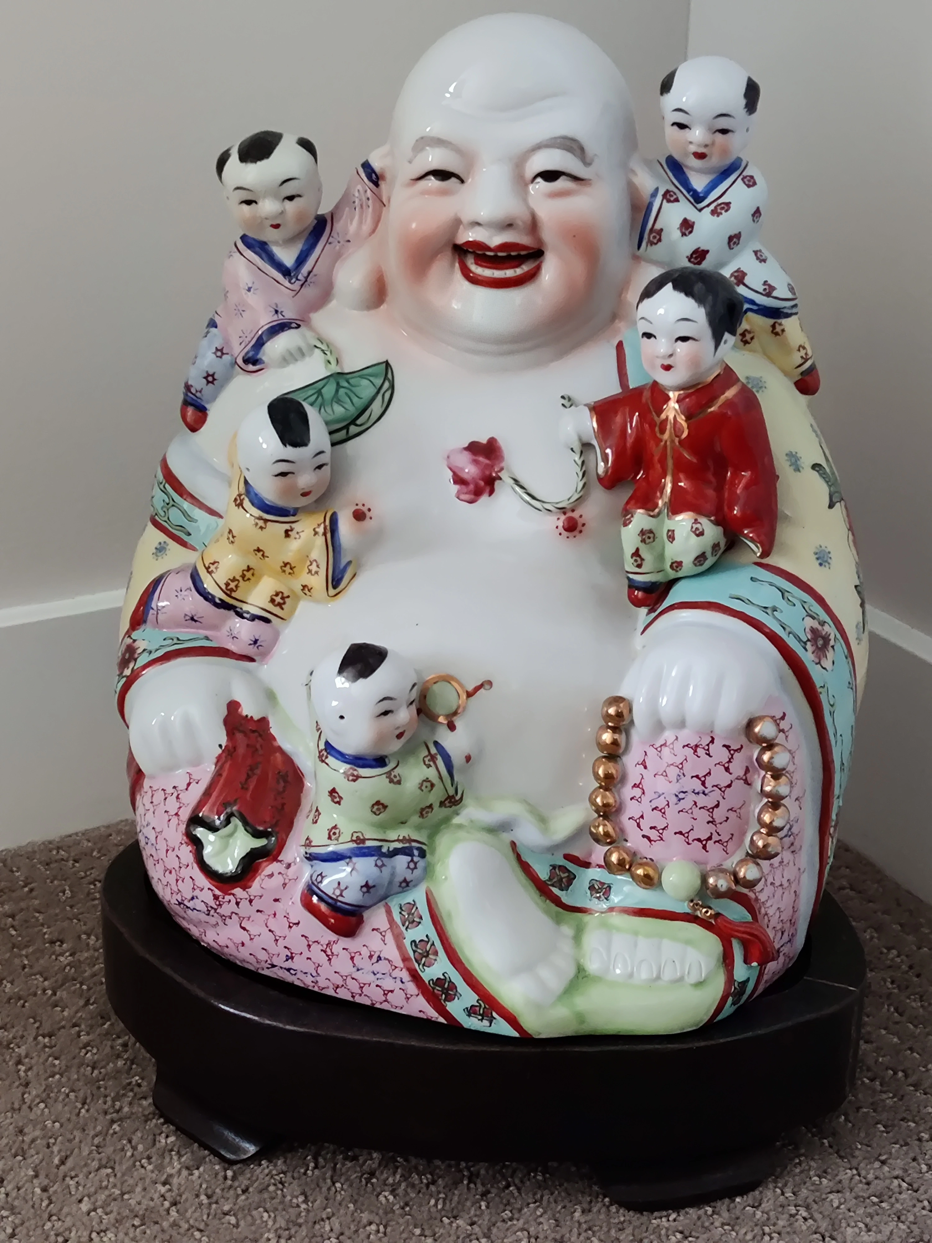 * Detailed Expressions: The Laughing Buddha’s smiling face and the children's joyful expressions are beautifully rendered, capturing the essence of the scene.