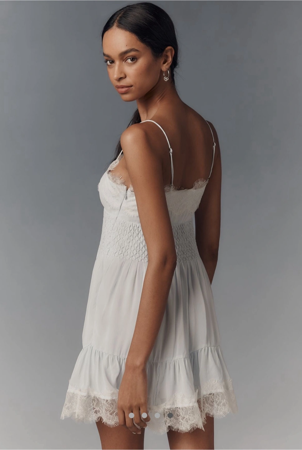 Soft and sweet cute blue mini dress with lace trim. It would be perfect for summer! 100% viscose.