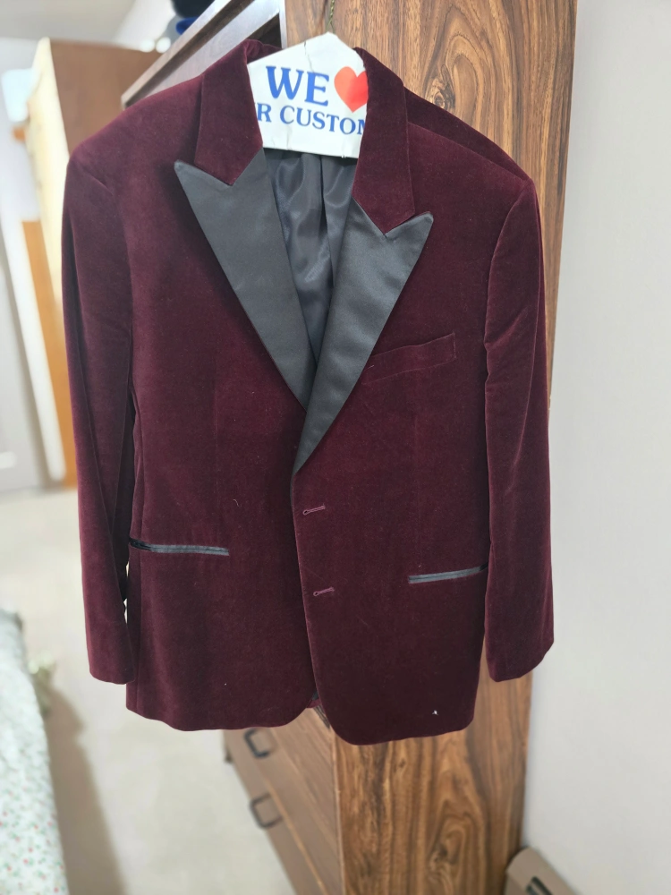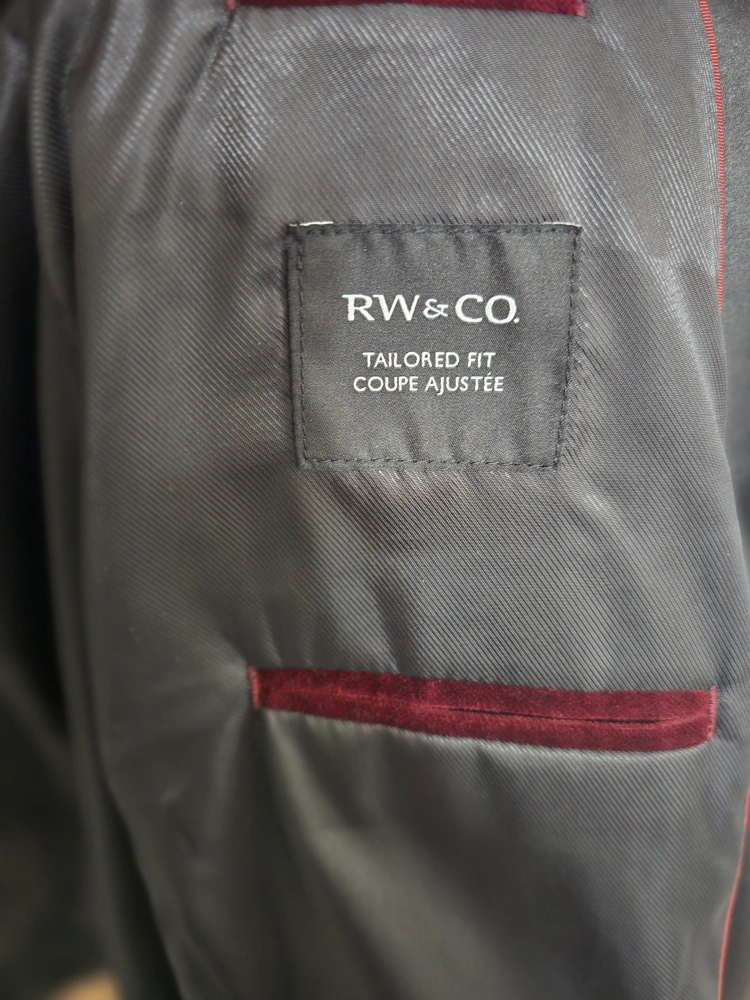 Selling a RW&CO. tailored fit blazer. It's a striking velvet material, perfect for dressing up an outfit!