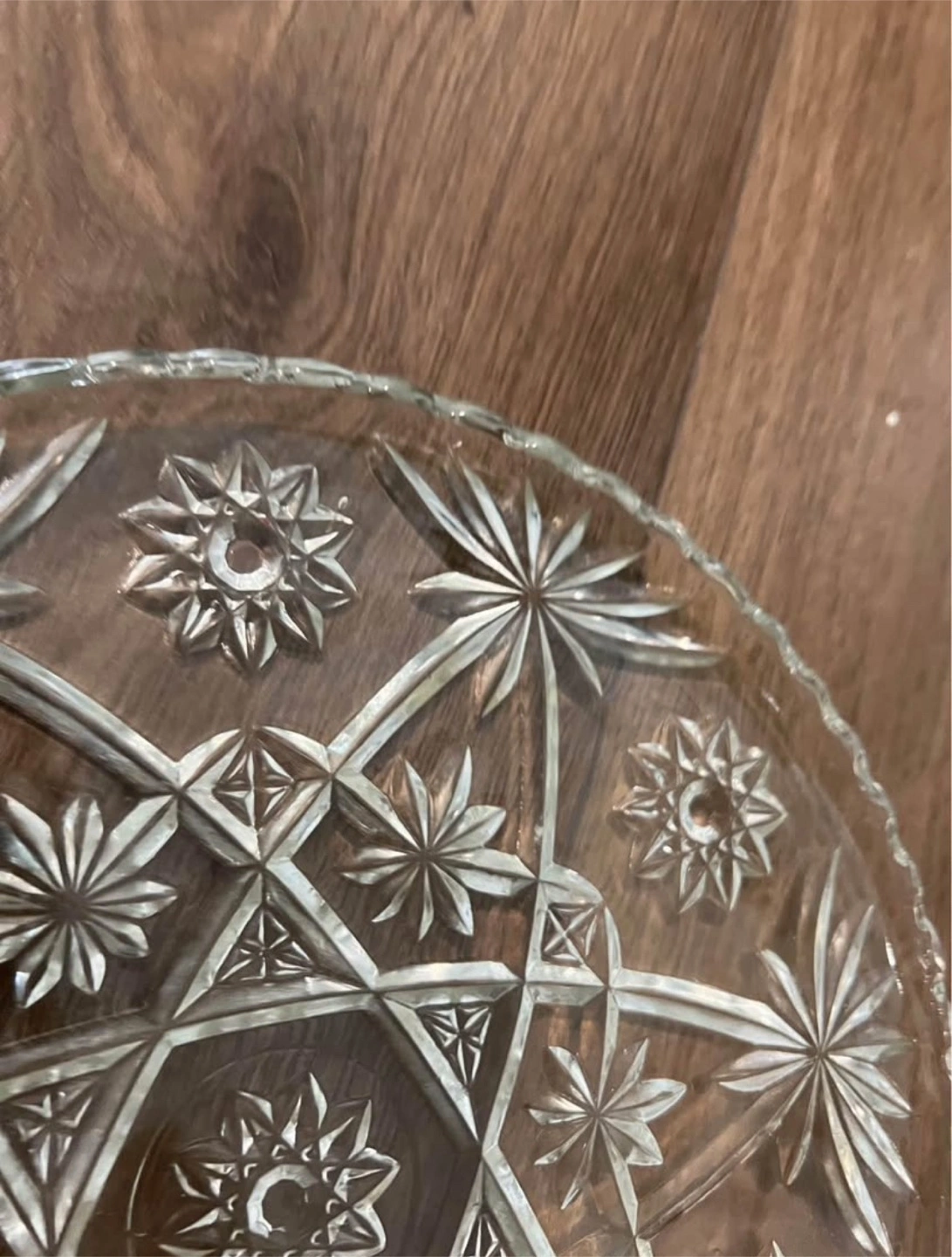 28Selling a beautiful vintage clear glass serving platter. It has a lovely starburst pattern etched into the glass, making it a unique piece for your table or display cabinet. It's in great condition and ready for a new home! One flat 13” and second flat 10” One with partition 13” One rectangular Hurontario and queens way