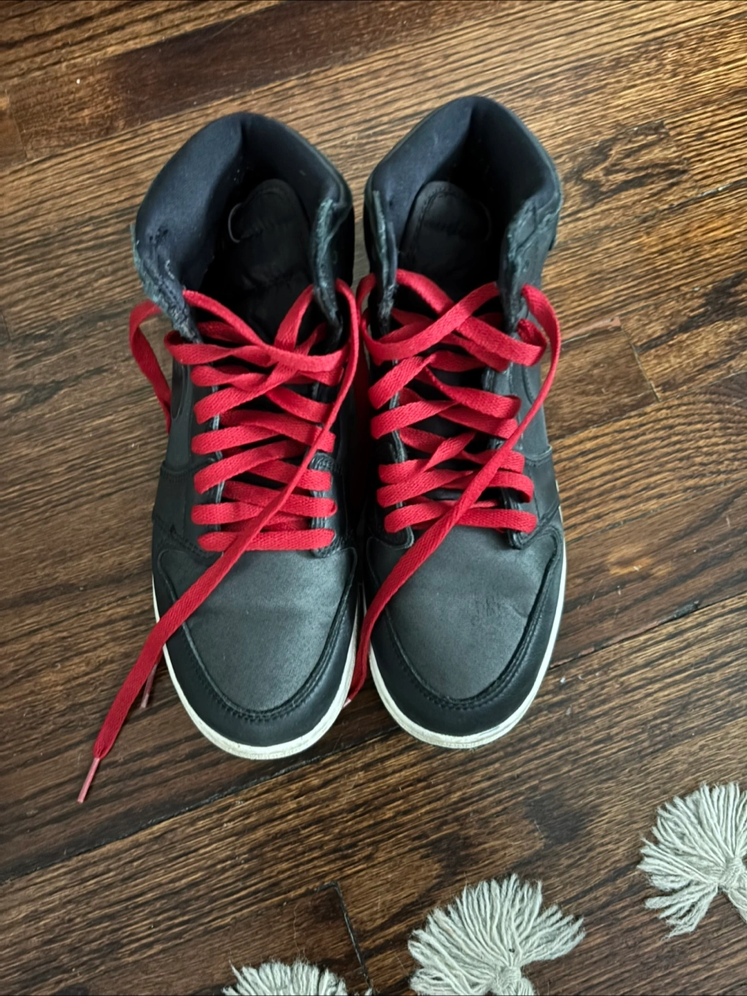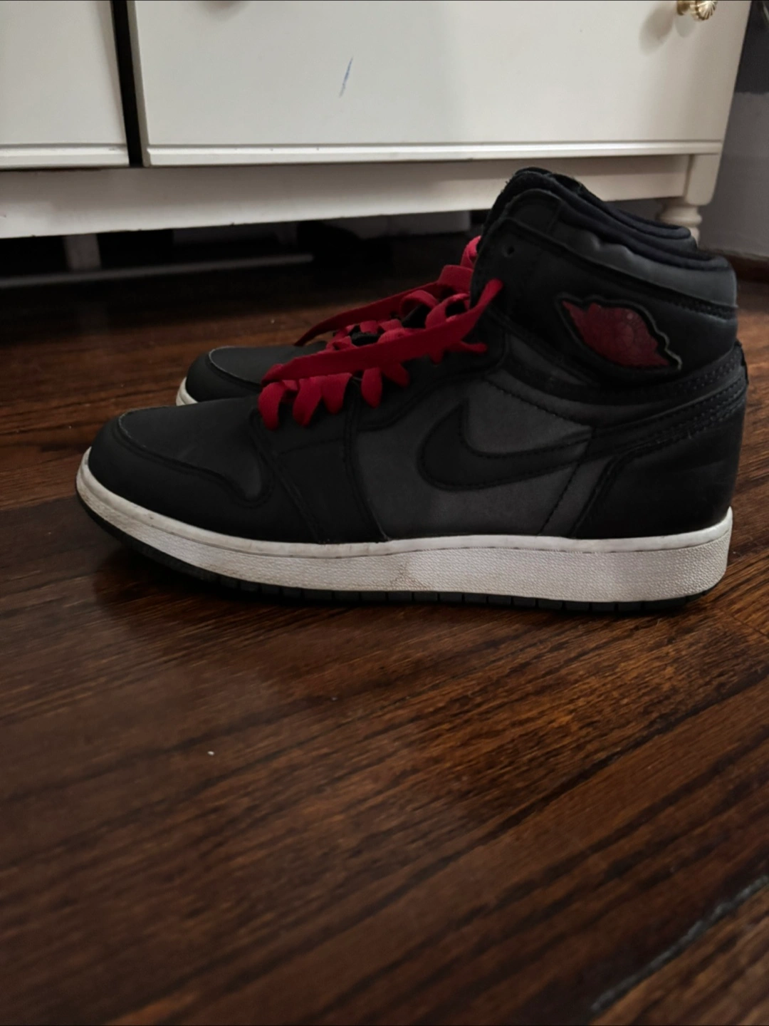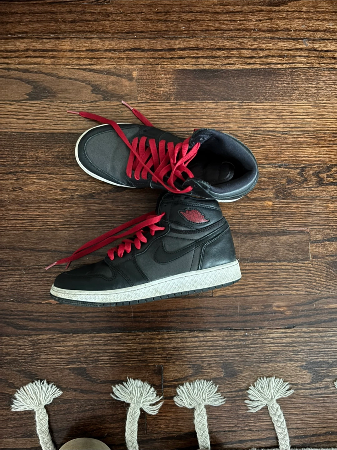 Selling a pair of Nike Air Jordan 1 High sneakers. They feature a classic black and red colourway. The shoes are in good condition with some signs of wear, as shown in the photos.