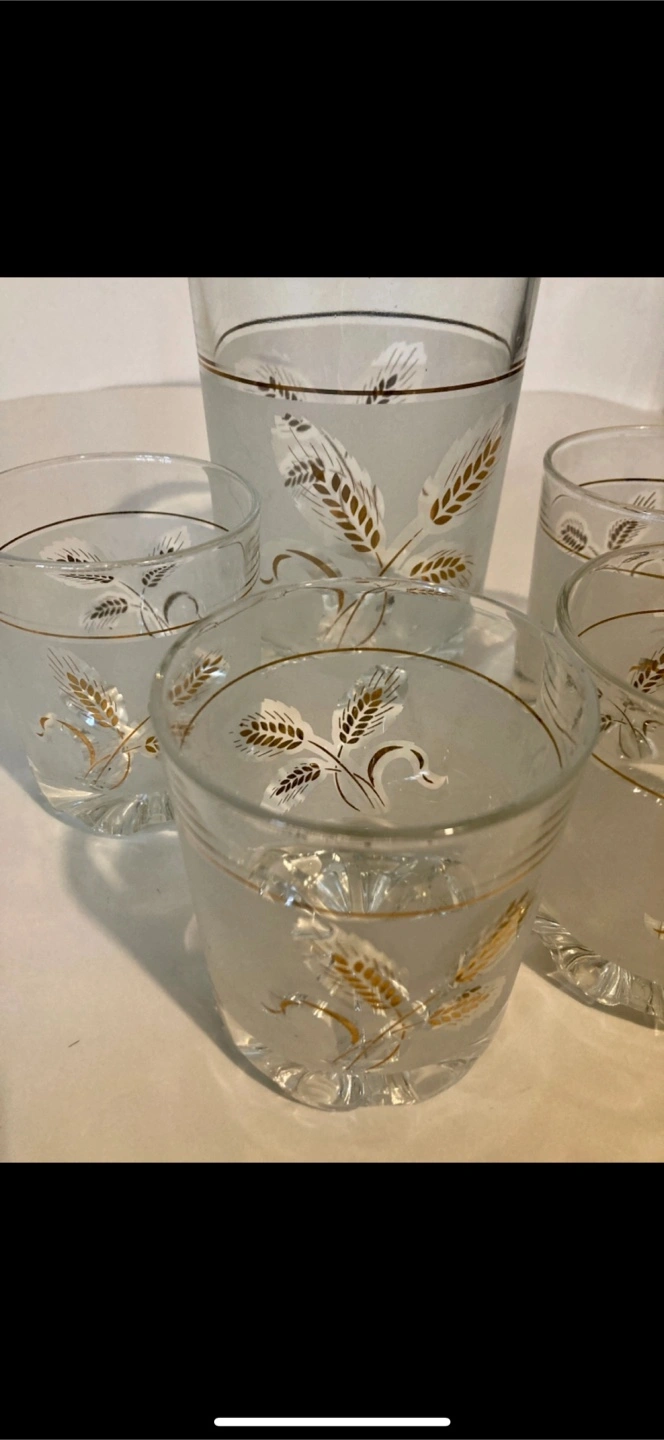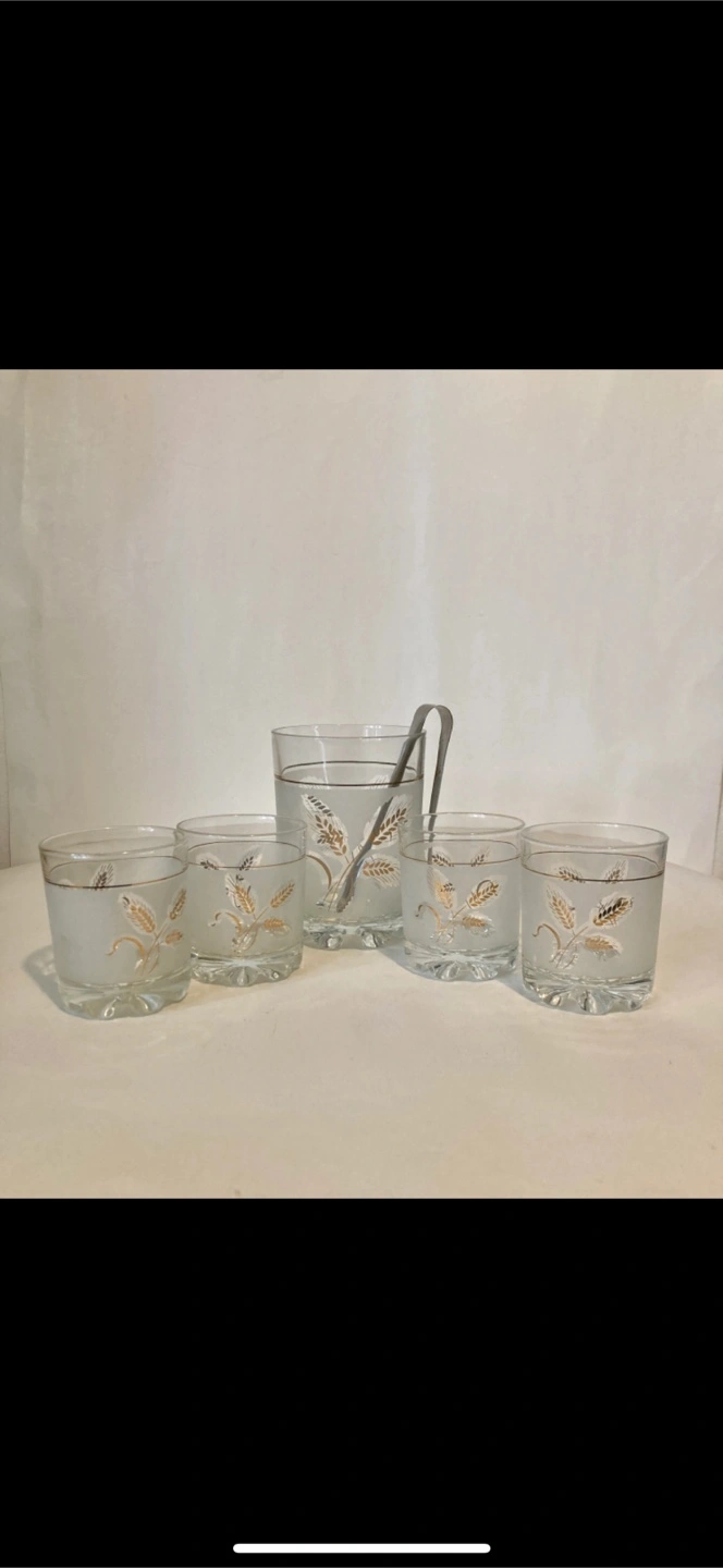 Selling a vintage frosted glass set featuring a wheat design! This set includes a pitcher and four glasses. It's perfect for adding a touch of retro charm to your home bar or kitchen. The glasses are in great condition and ready to be enjoyed. Tongs missing.