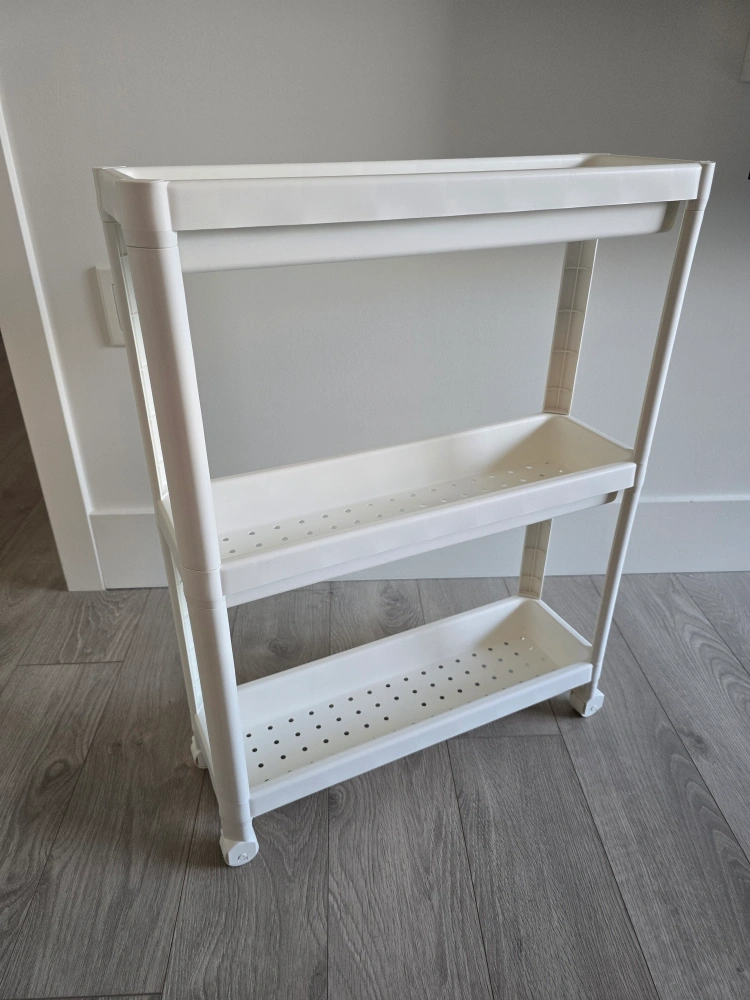 Selling an IKEA Vesken rolling cart in great condition! It's perfect for adding some extra storage to any room in your home. The cart is white and features three shelves with a perforated design. It's also on wheels, making it easy to move around. Great for the kitchen, bathroom, or even a craft room!