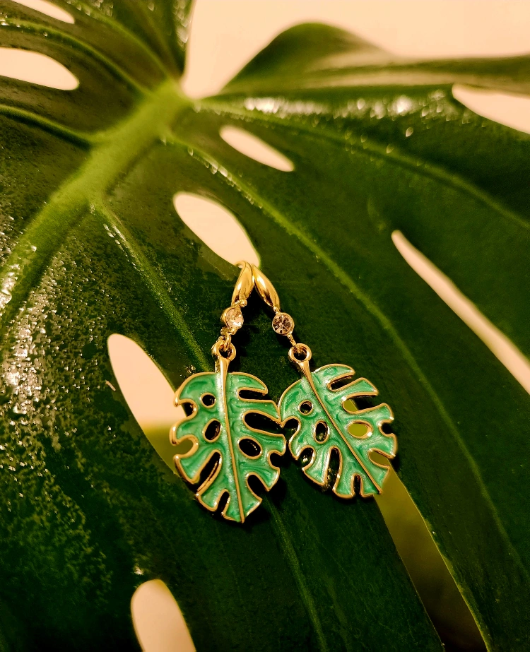 These are cute monstera leaf dangle earrings. They're green with gold trim and have little rhinestones at the top. Brand new