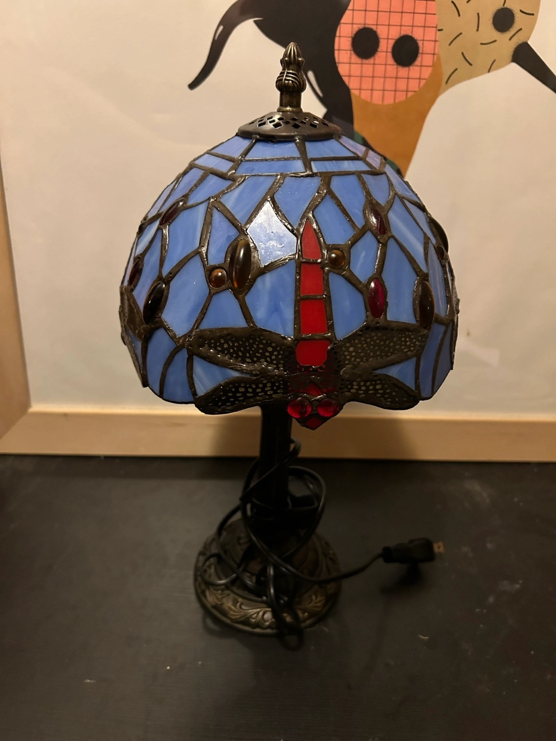 Add a touch of whimsy to any room with this beautiful dragonfly-style accent lamp! The blue and red stained glass design is sure to catch the eye. It's in great condition and ready to brighten up your space