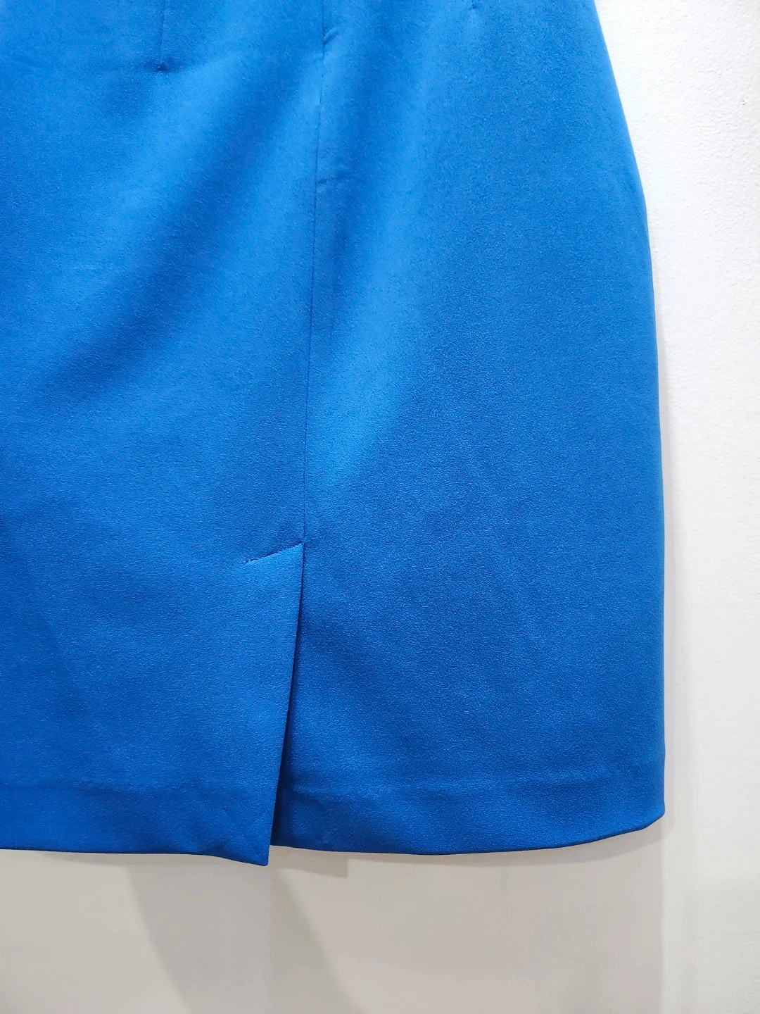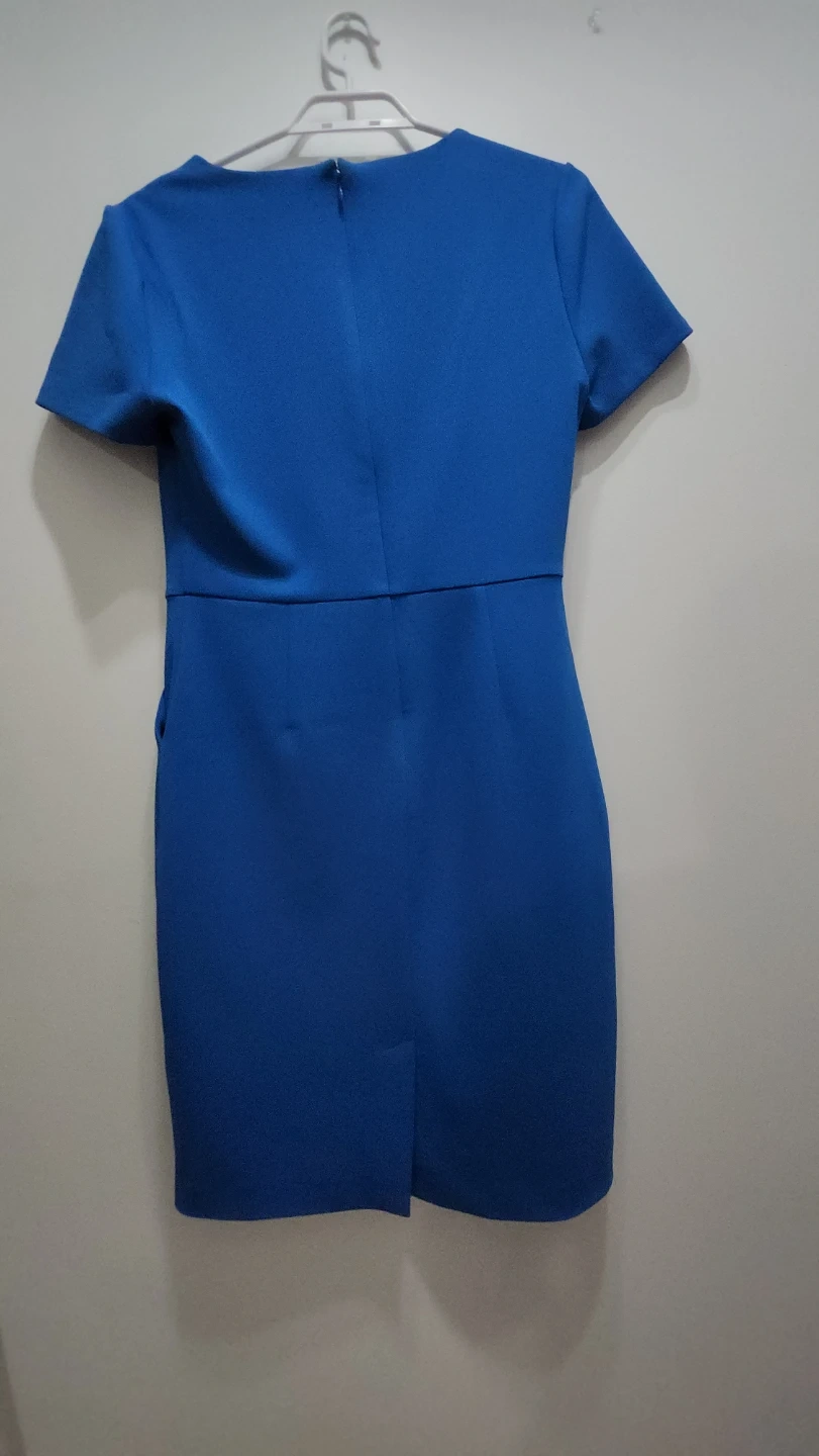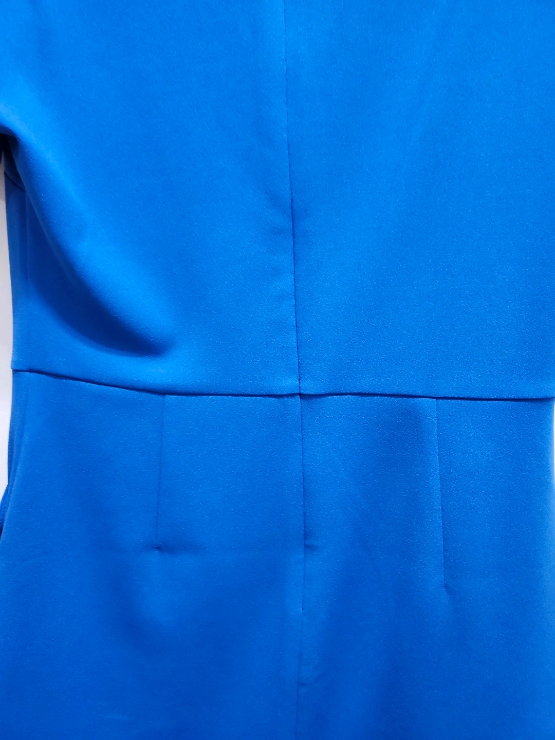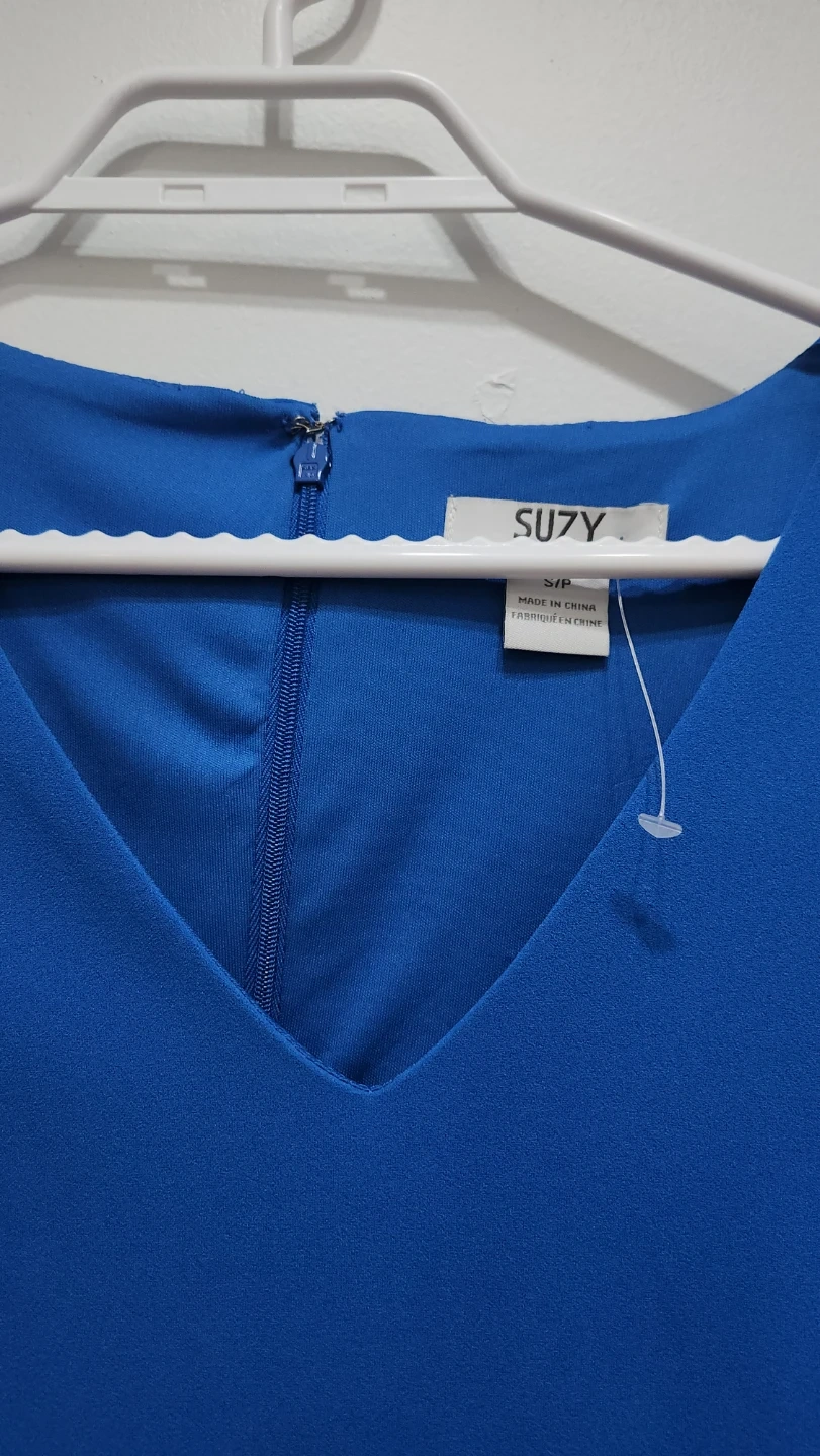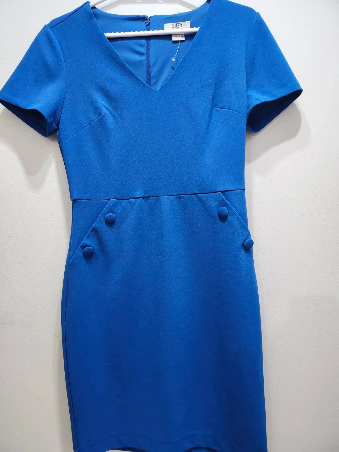 This Suzy dress is a lovely royal blue colour with a flattering V-neckline and short sleeves. It's a size S/P and features a back zipper closure and a subtle back slit. This dress is suitable for professional settings or a night out!
