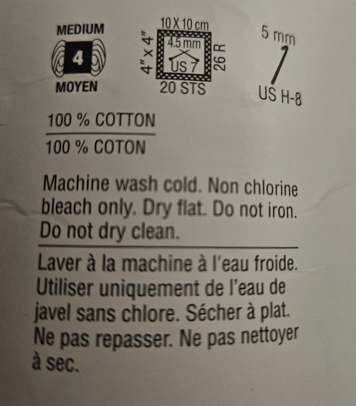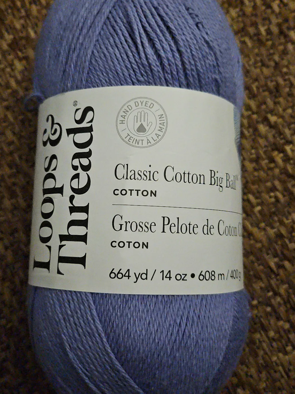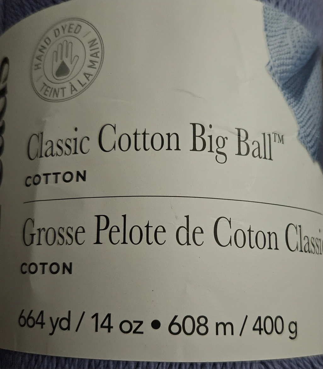Here's a Loops & Threads Classic Cotton Big Ball yarn! It's hand dyed and made of 100% cotton. The ball is just under 664 yd / 14 oz • 608 m / 400 g. It's medium weight (4). Machine wash cold, non-chlorine bleach only, dry flat, do not iron, and do not dry clean