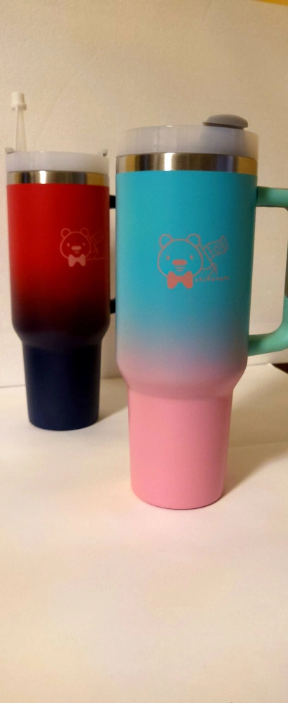 I have 50 pcs 40oz travel mugs available! They feature a sweat-resistant handle and come in two colour combinations: red/blue and aqua/pink. The box is included for each mugs!