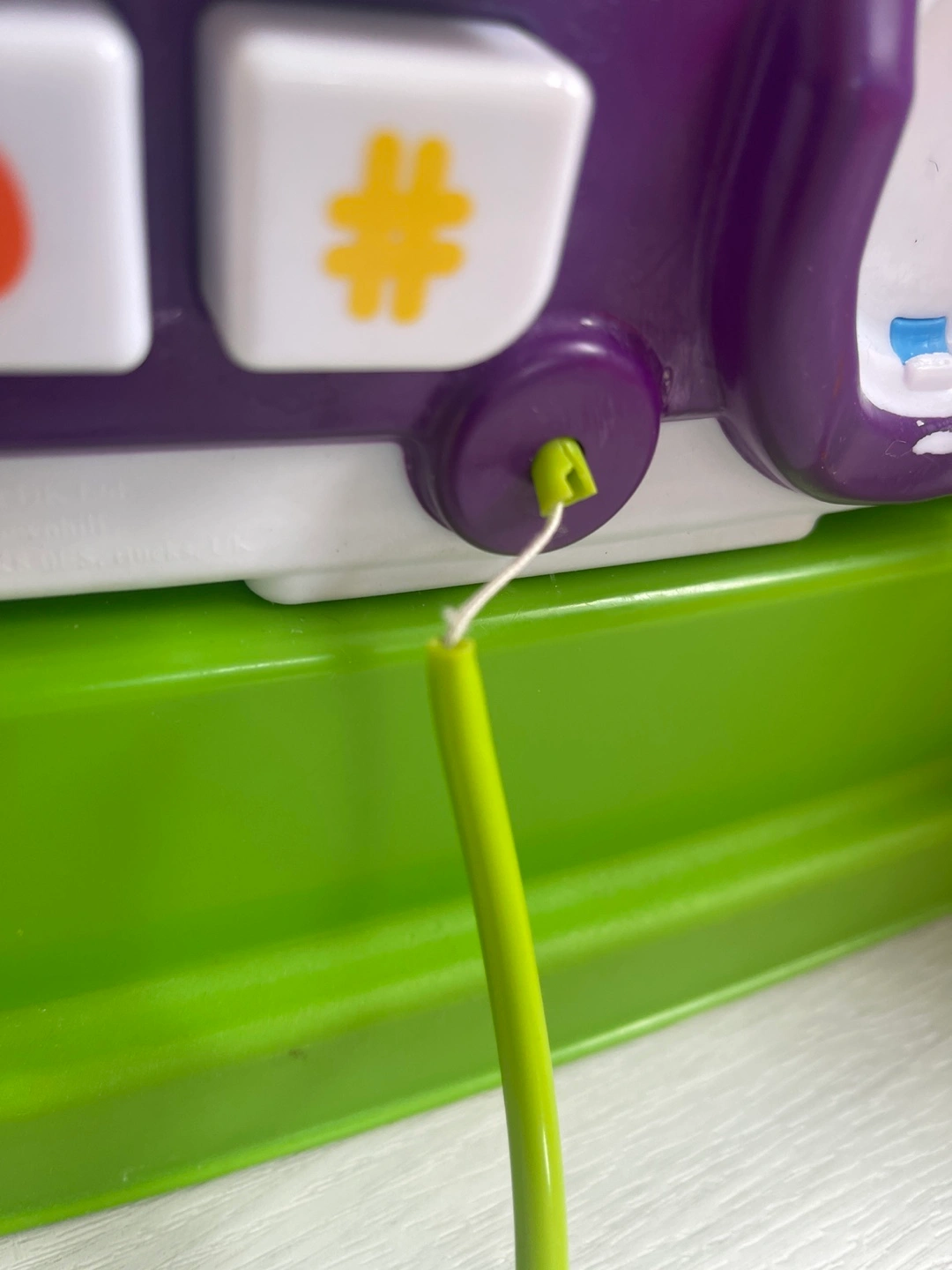 One sticker torn, phone cord is broken off but the phone is still attached.