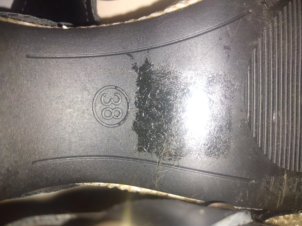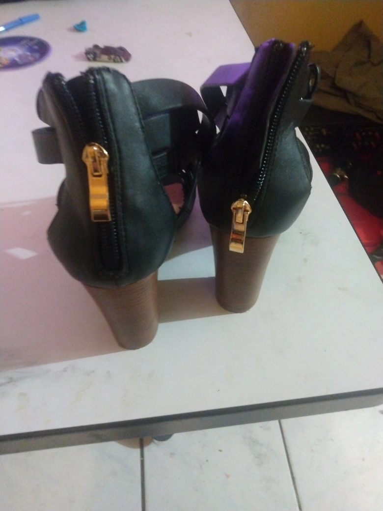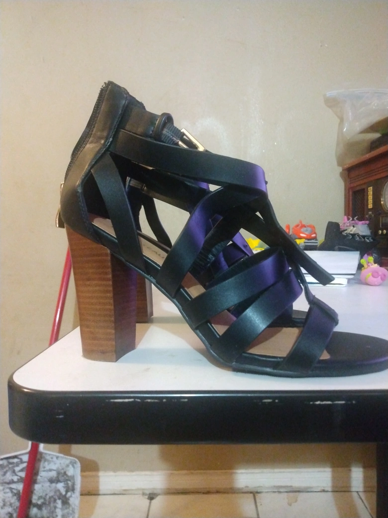 These black heeled sandals are a stylish addition to any outfit! They feature a zip-up back and a comfortable design. The size is marked as 38, which is equivalent to a US size 8. They are in good used condition and ready for a new home!