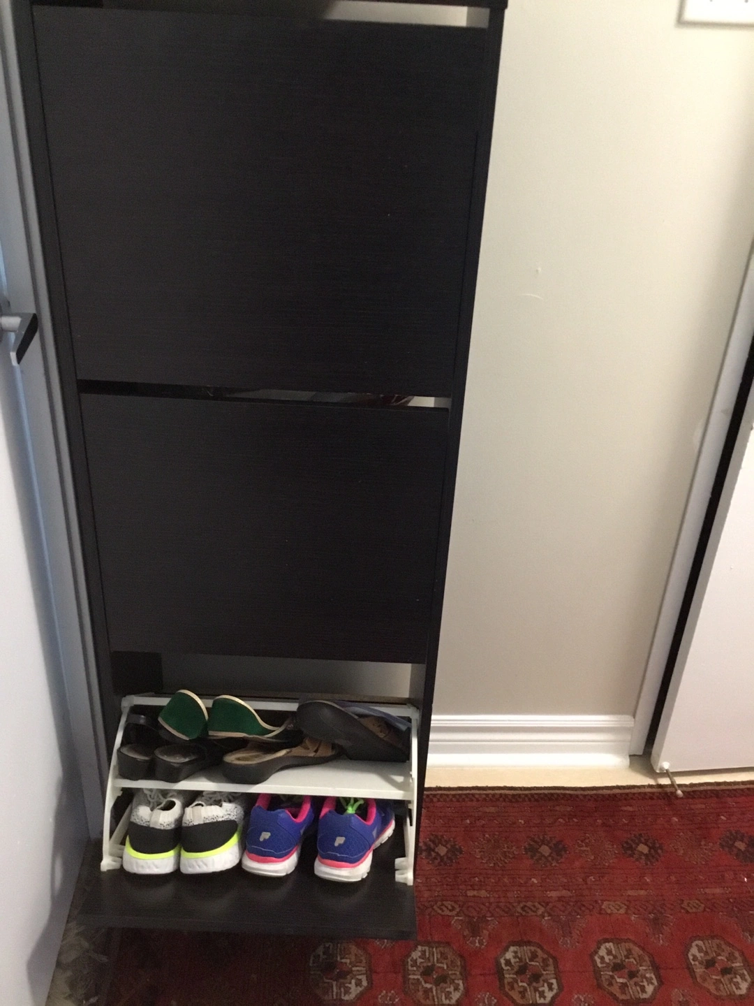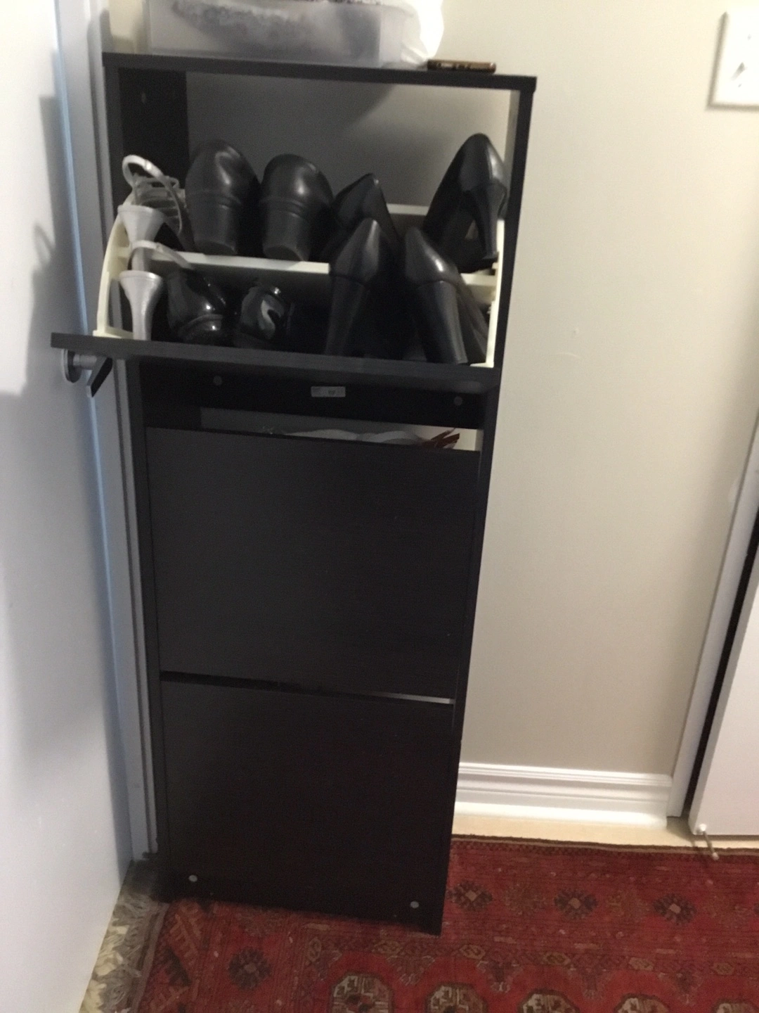 Selling a black Ikea shoe cabinet. It's in great condition and perfect for keeping your entryway organized. It can hold a good amount of shoes!