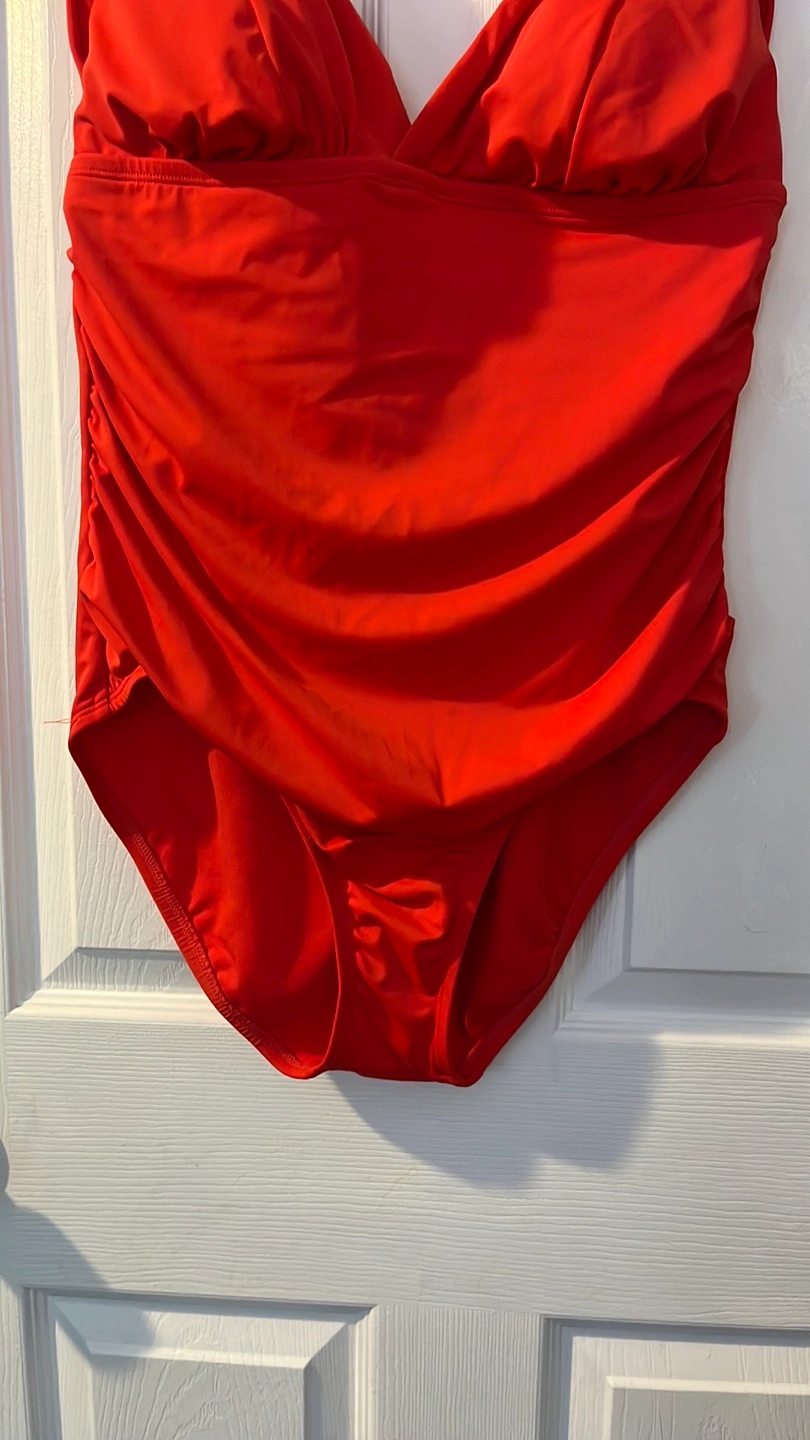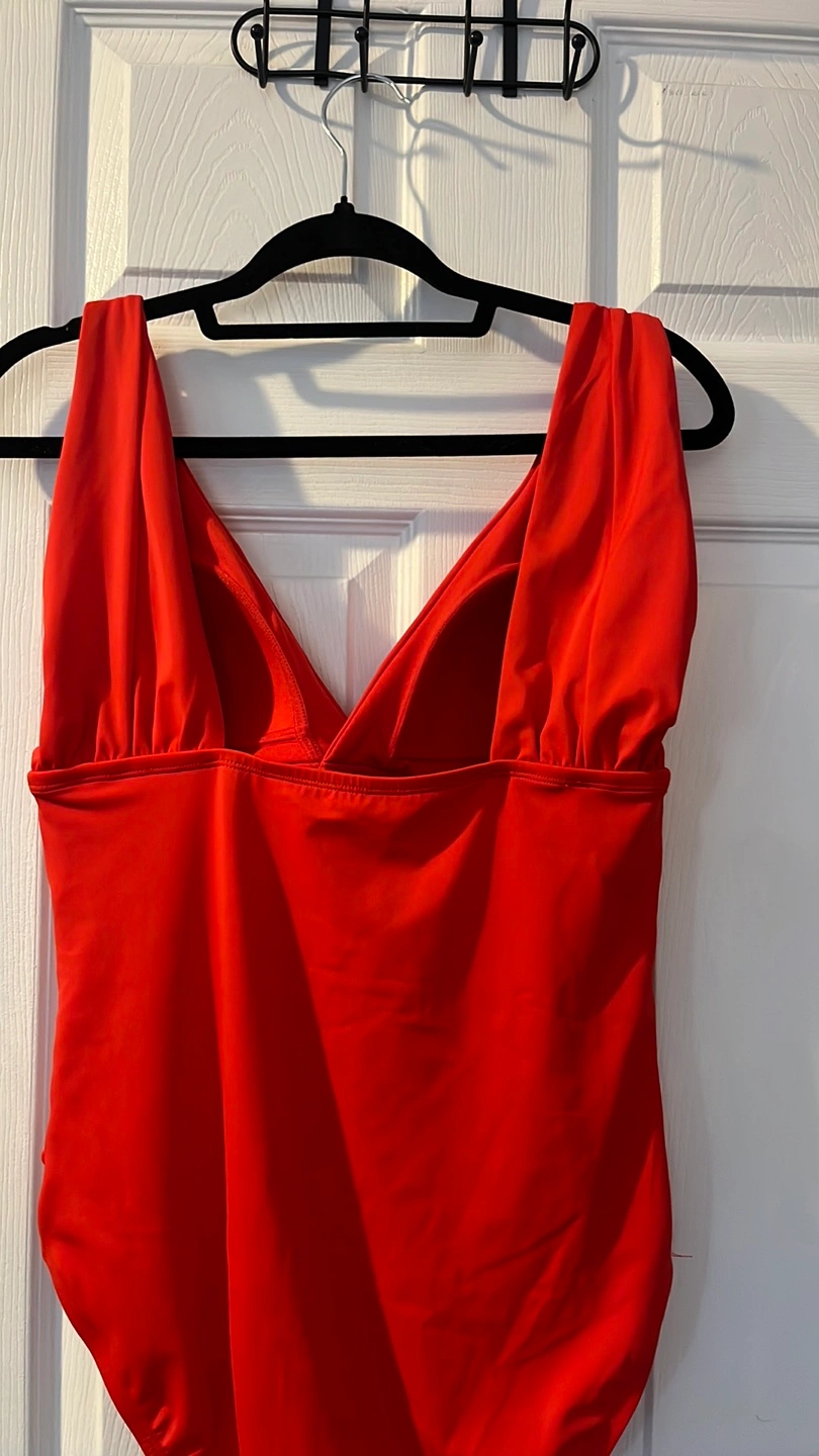 Here's a vibrant orange/red one-piece swimsuit! Thick straps for added boob support, ruching for the mom pouch. It's in great condition and ready for some fun in the sun.