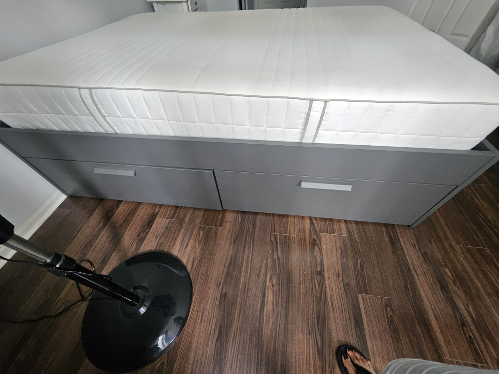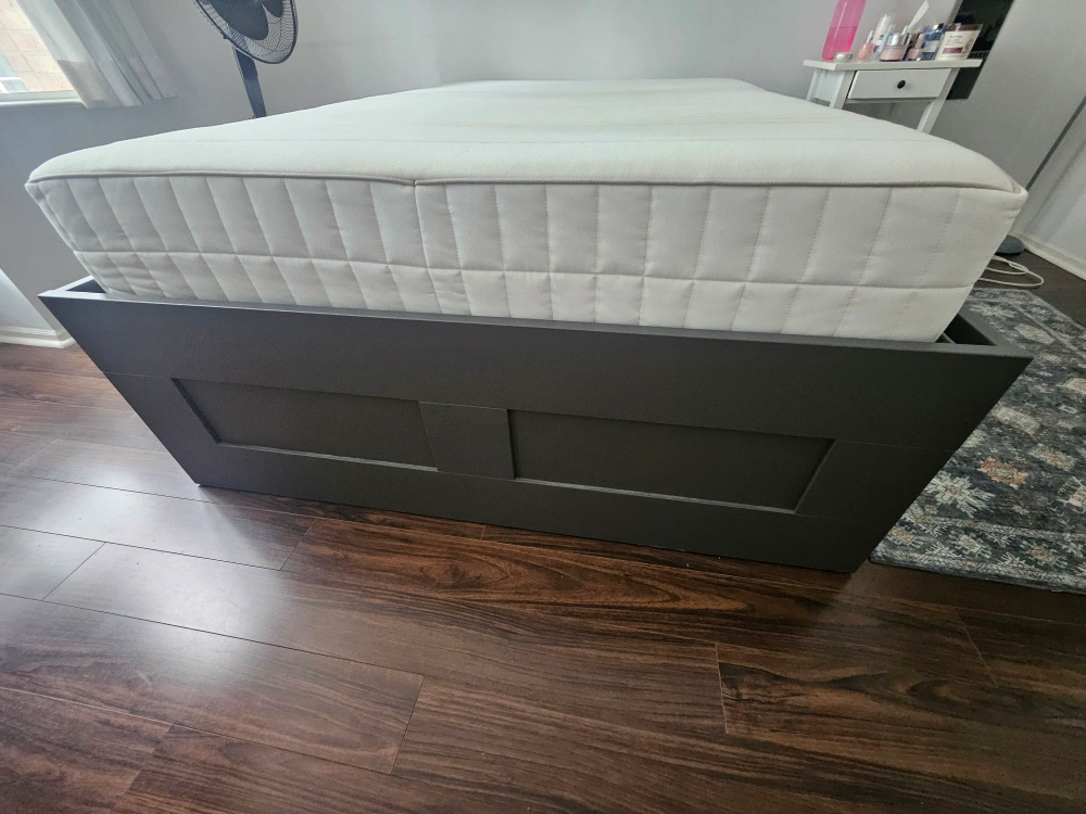 $ 350 (negotiable) Grey color IKEA Double Bed with ample storage bought in March 2023 and has been in a smoke free, pet free house. Only selling because looking to upgrade to a queen bed.